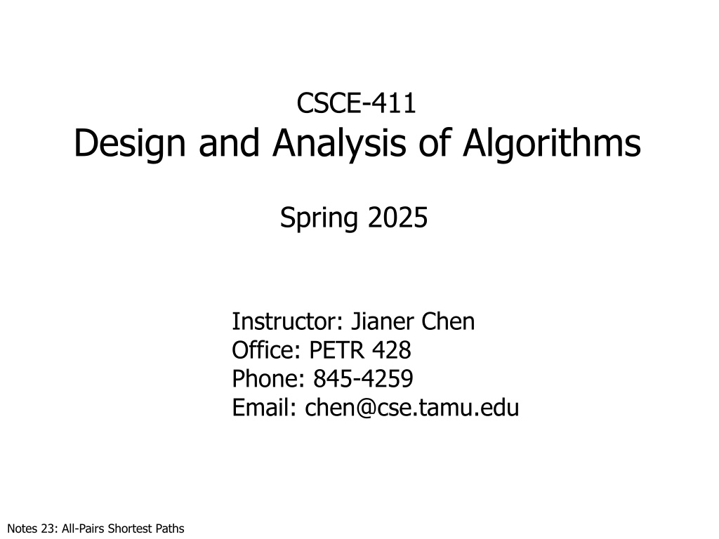 CSCE-411 Design and Analysis of Algorithms Spring 2025 Instructor: Jianer Chen Office: PETR 428 Phone: 845-4259 Email: chen@cse.tamu.edu Notes 23: All-Pairs Shortest Paths
