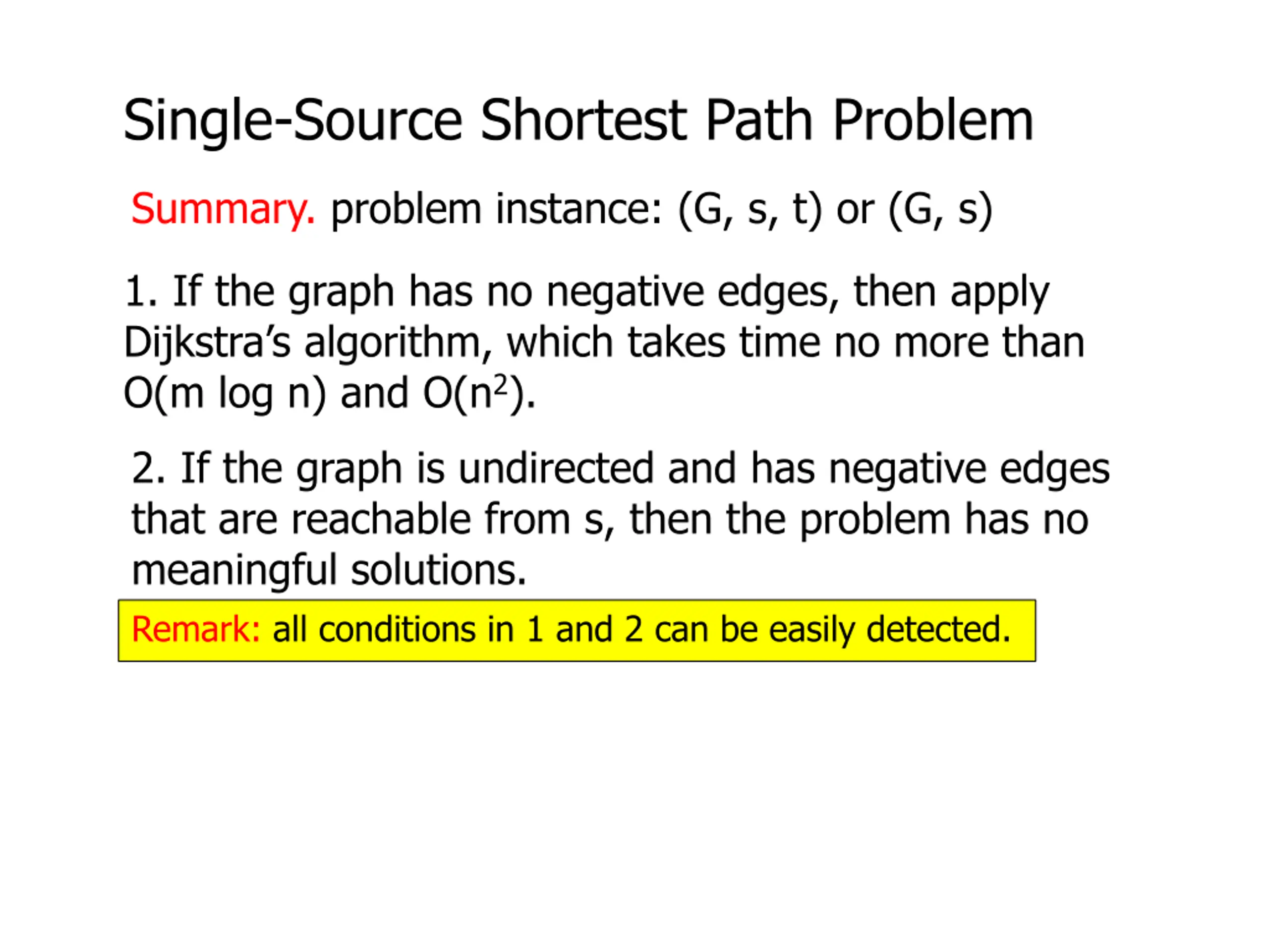 Single-Source Shortest Path Problem Summary. problem instance: (G, s, t) or (G, s) 1. If the graph has no negative edges, then apply Dijkstra s algorithm, which takes time no more than O(m log n) and O(n2). 2. If the graph is undirected and has negative edges that are reachable from s, then the problem has no meaningful solutions. Remark: all conditions in 1 and 2 can be easily detected.