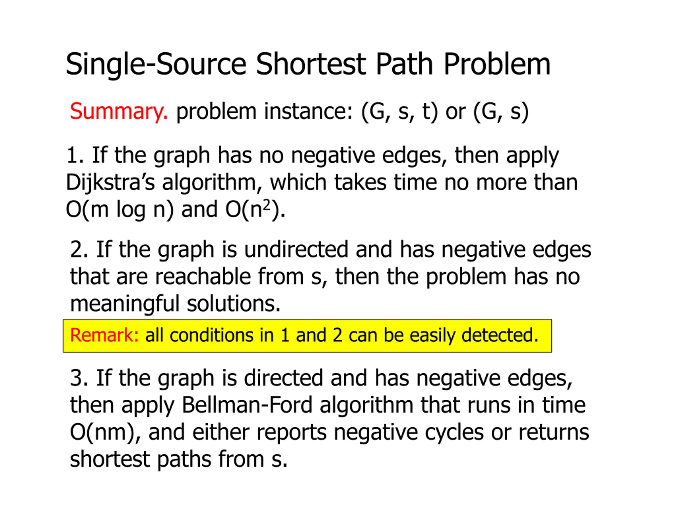 Single-Source Shortest Path Problem Summary. problem instance: (G, s, t) or (G, s) 1. If the graph has no negative edges, then apply Dijkstra s algorithm, which takes time no more than O(m log n) and O(n2). 2. If the graph is undirected and has negative edges that are reachable from s, then the problem has no meaningful solutions.
