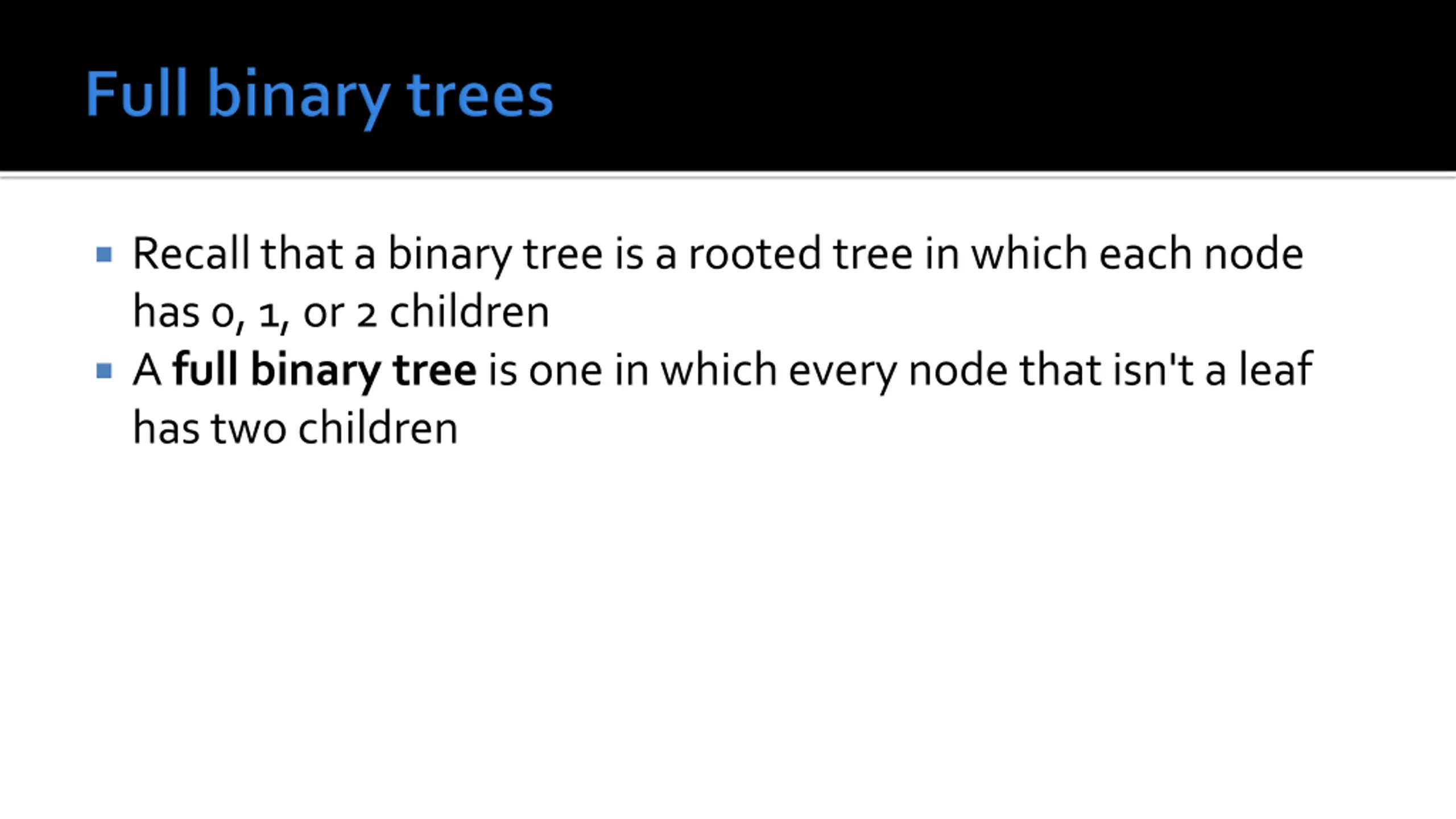 Recall that a binary tree is a rooted tree in which each node has 0, 1, or 2 children A full binary tree is one in which every node that isn't a leaf has two children