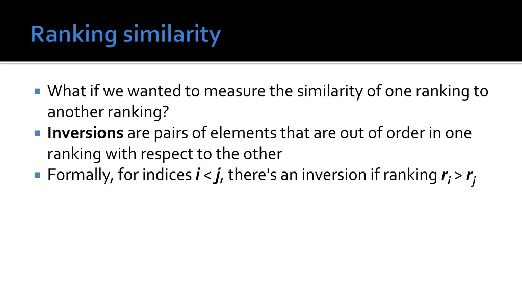 What if we wanted to measure the similarity of one ranking to another ranking? Inversions are pairs of elements that are out of order in one ranking with respect to the other Formally, for indices i < j, there's an inversion if ranking ri > rj