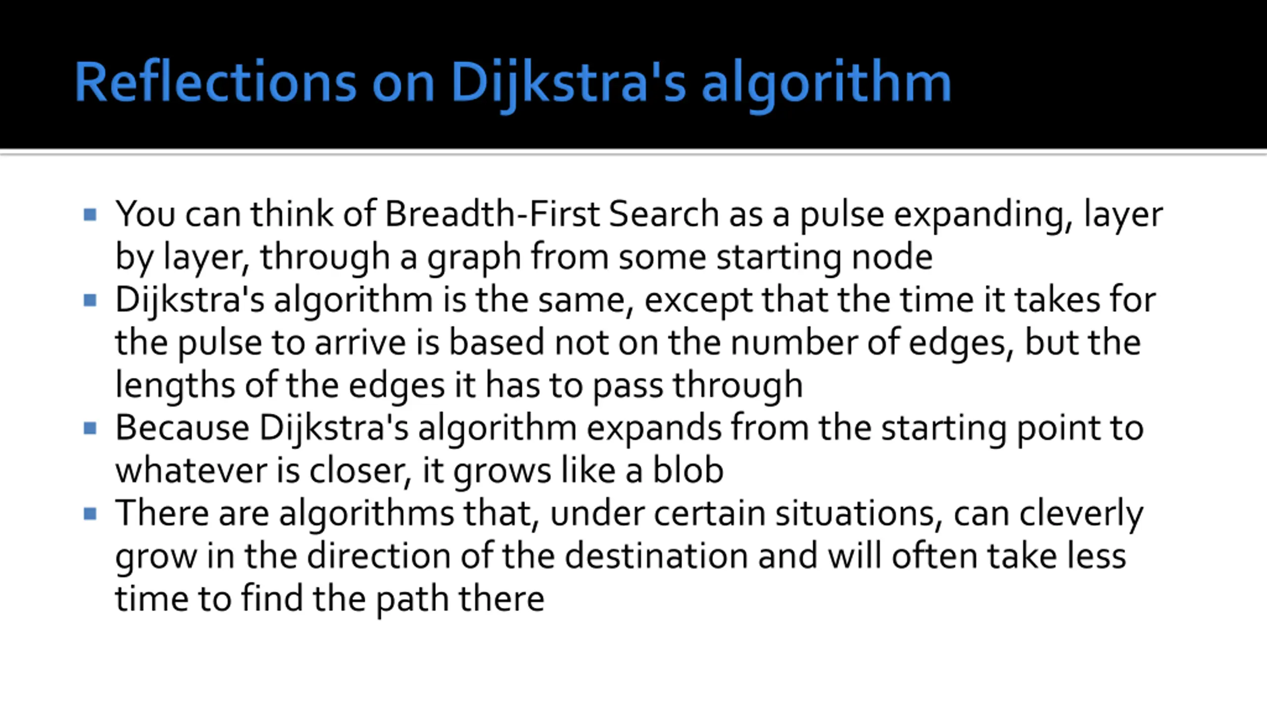 You can think of Breadth-First Search as a pulse expanding, layer by layer, through a graph from some starting node Dijkstra's algorithm is the same, except that the time it takes for the pulse to arrive is based not on the number of edges, but the lengths of the edges it has to pass through Because Dijkstra's algorithm expands from the starting point to whatever is closer, it grows like a blob There are algorithms that, under certain situations, can cleverly grow in the direction of the destination and will often take less time to find the path there