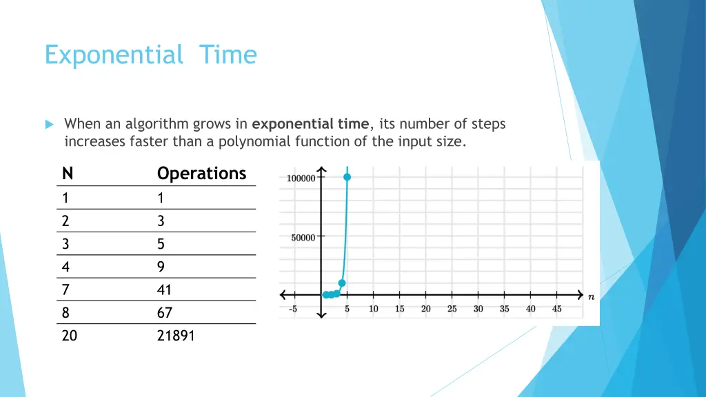 Exponential Time When an algorithm grows in exponential time, its number of steps increases faster than a polynomial function of the input size. N 1 2 3 4 7 8 20 Operations 1 3 5 9 41 67 21891
