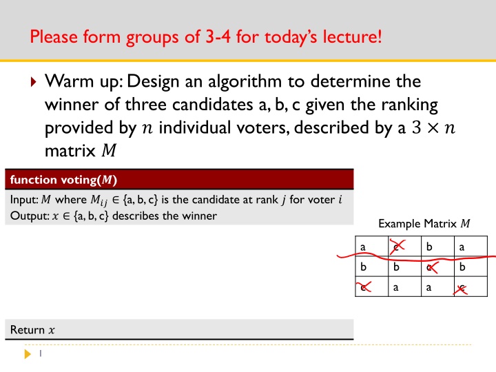 Please form groups of 3-4 for todays lecture! Warm up: Design an algorithm to determine the winner of three candidates a, b, c given the ranking provided by ? individual voters, described by a 3 ? matrix ? function voting(?) Input: ? where ??? {a,b, c} is the candidate at rank ? for voter ? Output: ? {a, b, c} describes the winner Example Matrix ? a b c c b a b c a a b c Return ? 1