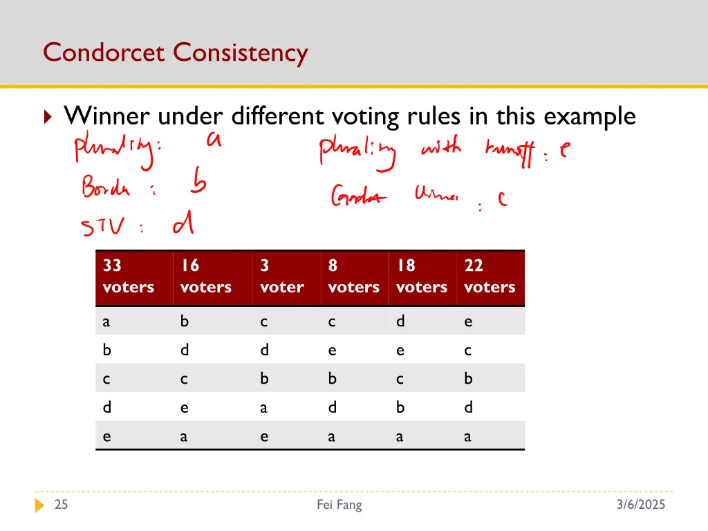 Condorcet Consistency Condorcet consistency: A voting rule satisfies majority consistency should select a Condorcet Winner as the final winner if one exists. Which of the introduced voting rules (Plurality, Borda count, Plurality with runoff, STV) are Condorcet consistent? 24 Fei Fang 3/6/2025