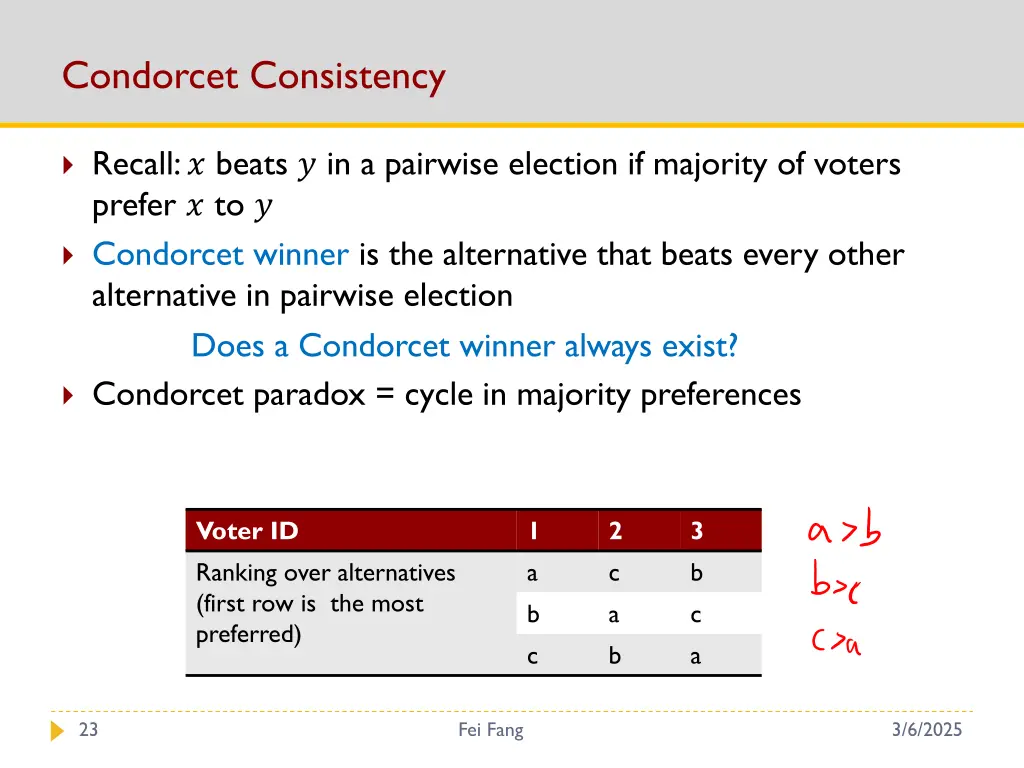 Condorcet Consistency Recall: ? beats ? in a pairwise election if majority of voters prefer ? to ? Condorcet winner is the alternative that beats every other alternative in pairwise election Does a Condorcet winner always exist? Condorcet paradox = cycle in majority preferences Voter ID Ranking over alternatives (first row is the most preferred) 1 a b c 2 c a b 3 b c a 23 Fei Fang 3/6/2025
