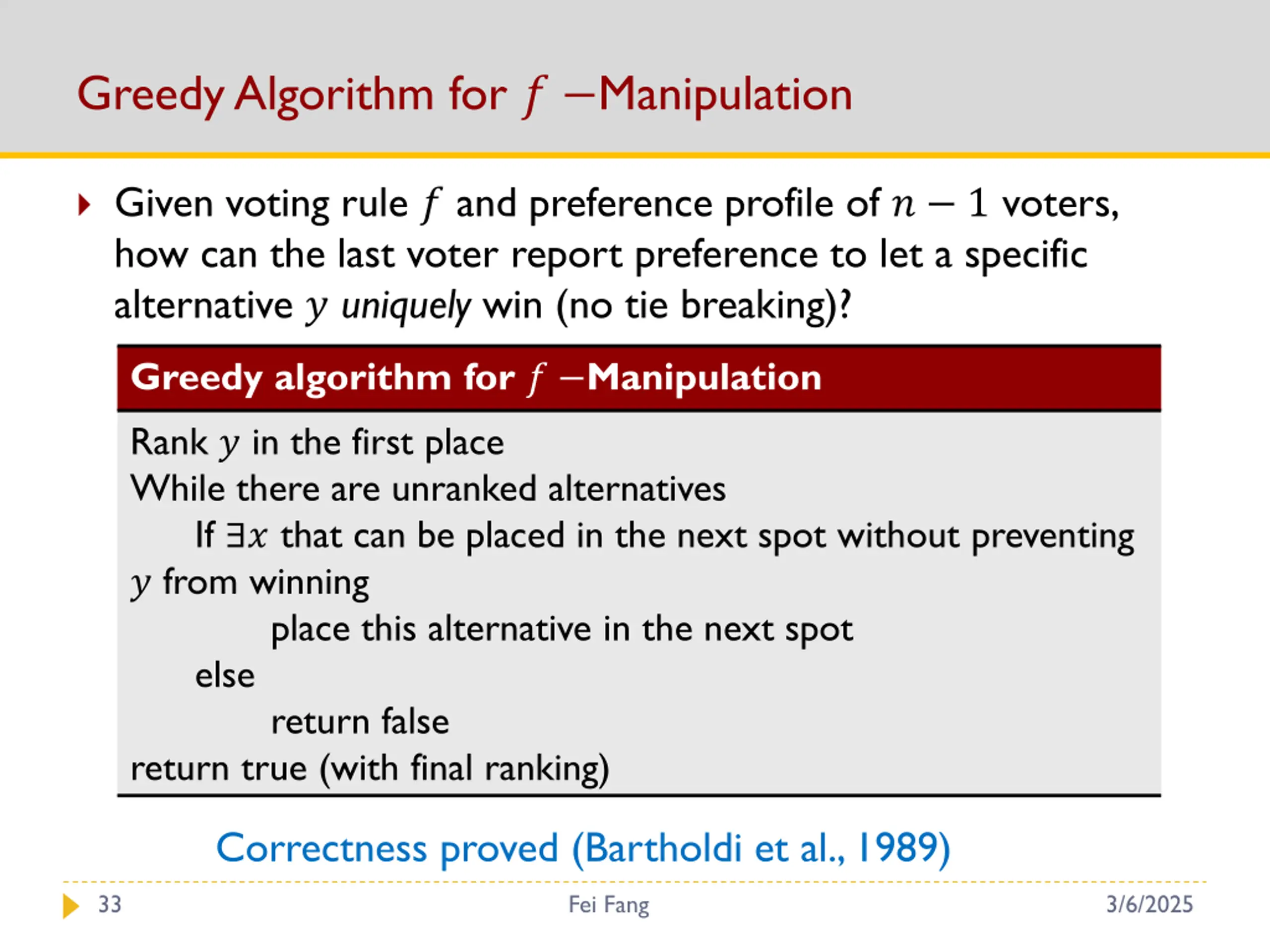 Greedy Algorithm for ? Manipulation Given voting rule ? and preference profile of ? 1 voters, how can the last voter report preference to let a specific alternative ?uniquely win (no tie breaking)? Greedy algorithm for ? Manipulation Rank ? in the first place While there are unranked alternatives If ? that can be placed in the next spot without preventing ? from winning place this alternative in the next spot else return false return true (with final ranking) Correctness proved (Bartholdi et al., 1989) 33 Fei Fang 3/6/2025