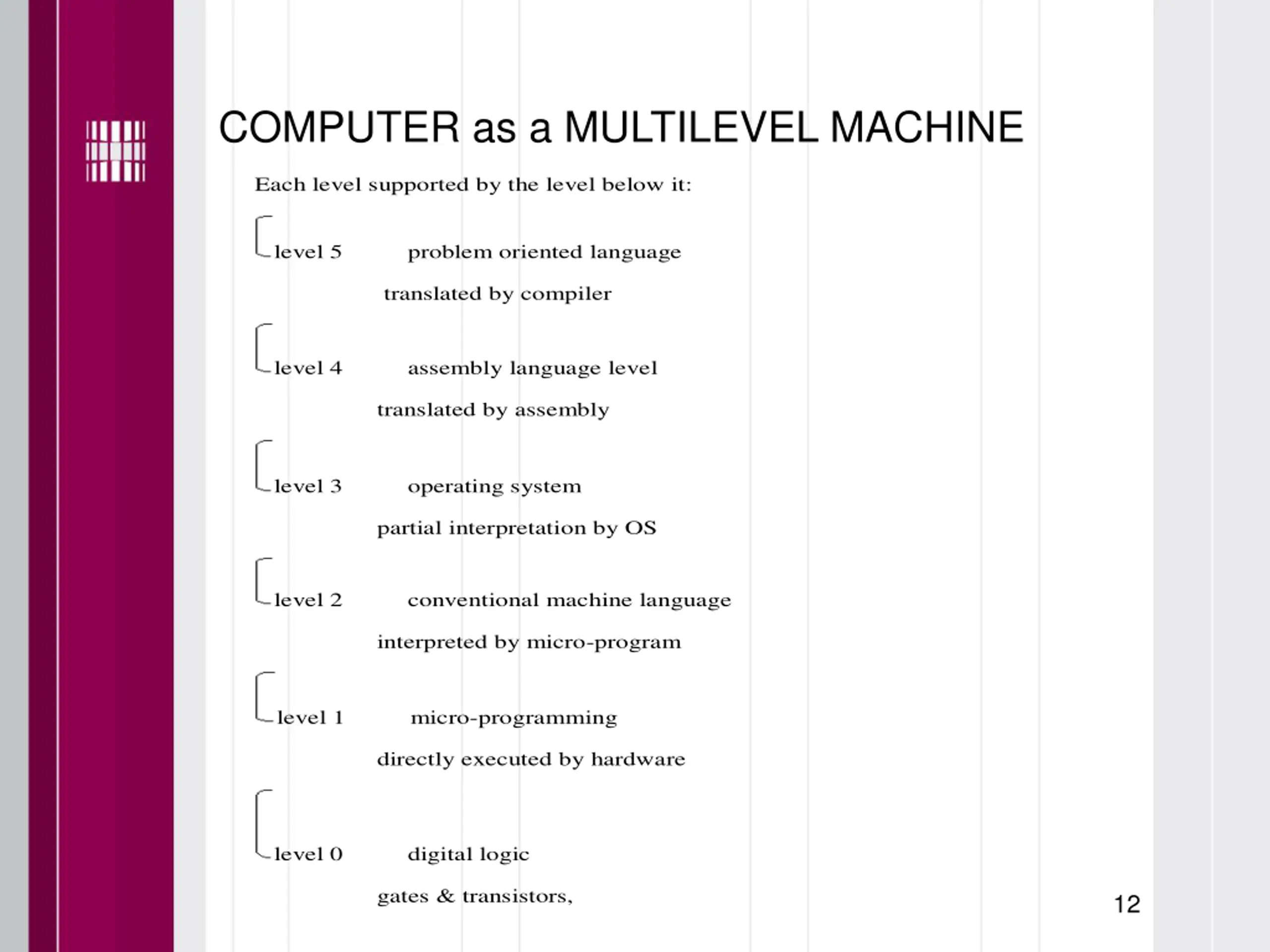 COMPUTER as a MULTILEVEL MACHINE Each level supported by the level below it: level 5 problem oriented language translated by compiler level 4 assembly language level translated by assembly level 3 operating system partial interpretation by OS level 2 conventional machine language interpreted by micro-program level 1 micro-programming directly executed by hardware level 0 digital logic gates & transistors, 12