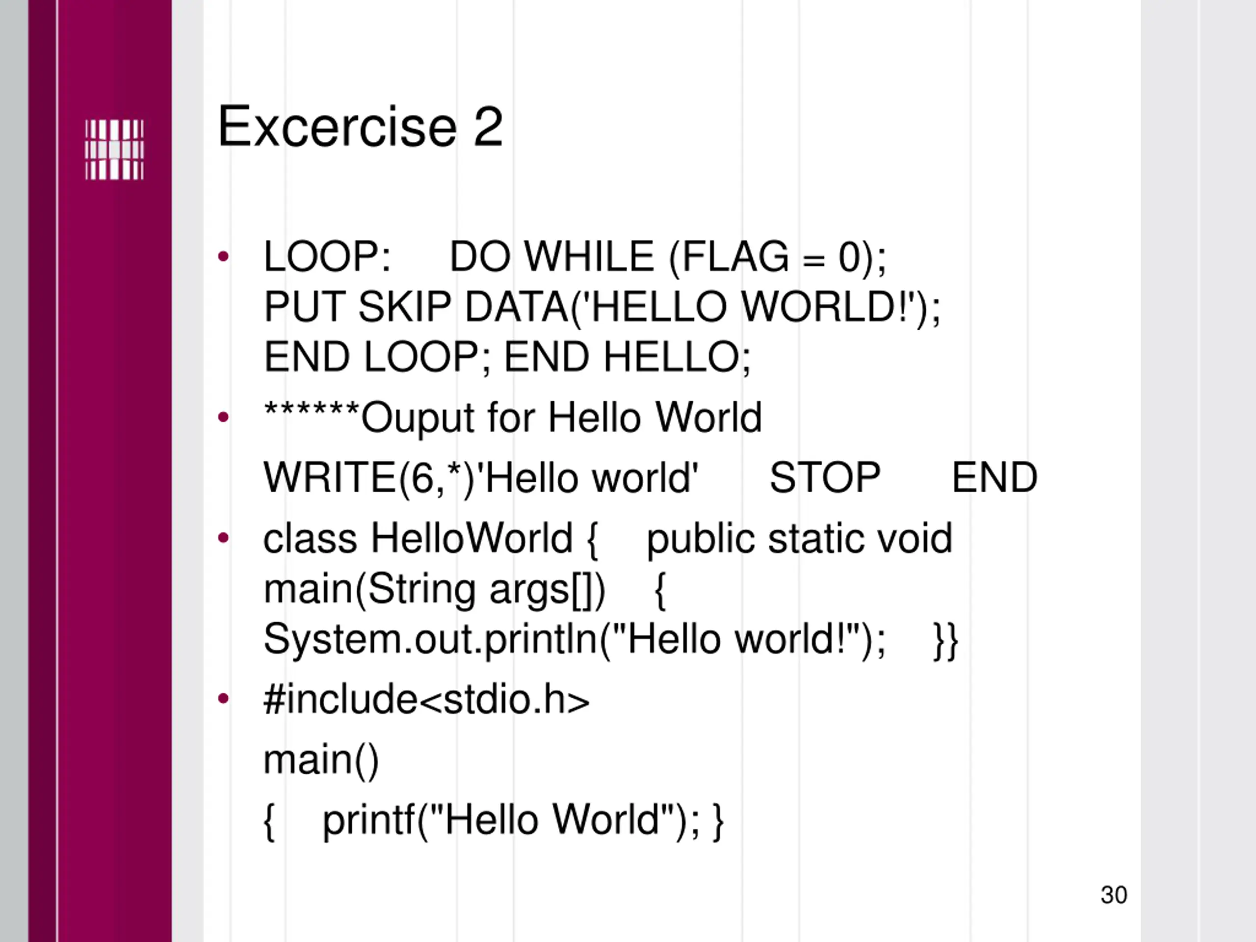 Excercise 2 LOOP: DO WHILE (FLAG = 0); PUT SKIP DATA('HELLO WORLD!'); END LOOP; END HELLO; ******Ouput for Hello World WRITE(6,*)'Hello world' STOP END class HelloWorld { public static void main(String args[]) { System.out.println("Hello world!"); }} #include<stdio.h> main() { printf("Hello World"); } 30