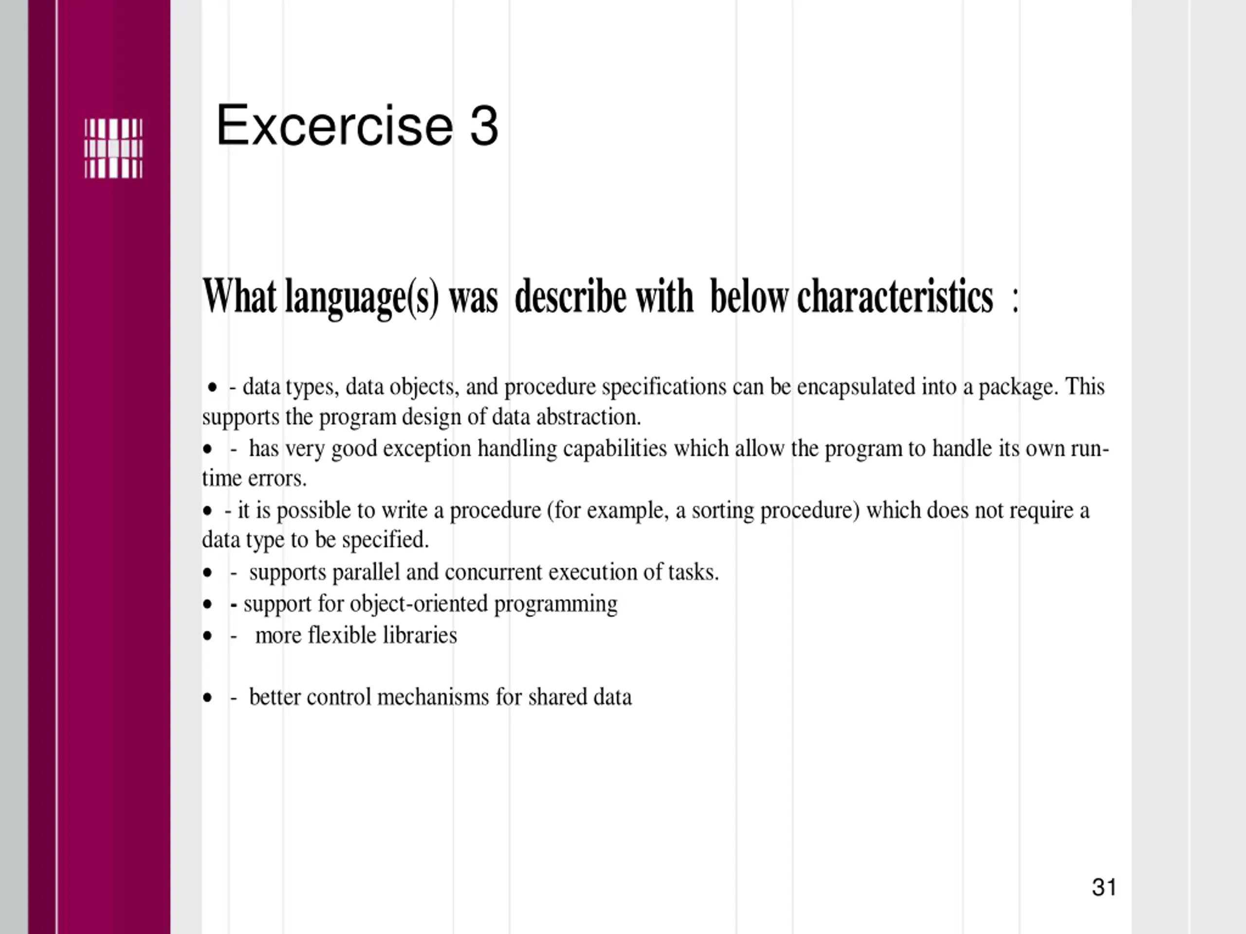 Excercise 3 What language(s) was describe with below characteristics : - data types, data objects, and procedure specifications can be encapsulated into a package. This supports the program design of data abstraction. - has very good exception handling capabilities which allow the program to handle its own run- time errors. - it is possible to write a procedure (for example, a sorting procedure) which does not require a data type to be specified. - supports parallel and concurrent execution of tasks. - support for object-oriented programming - more flexible libraries - better control mechanisms for shared data 31