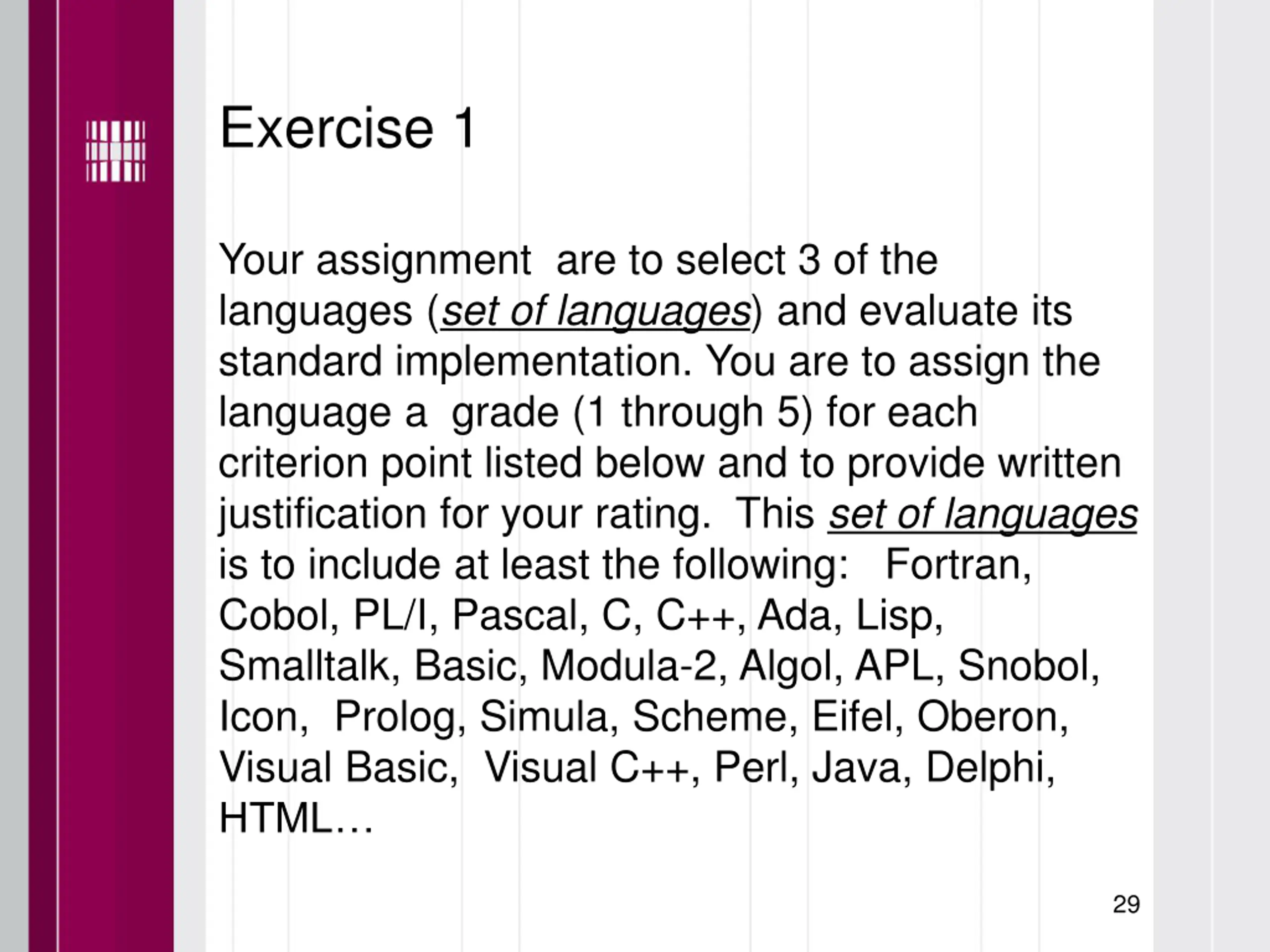 Exercise 1 Your assignment are to select 3 of the languages (set of languages) and evaluate its standard implementation. You are to assign the language a grade (1 through 5) for each criterion point listed below and to provide written justification for your rating. This set of languages is to include at least the following: Fortran, Cobol, PL/I, Pascal, C, C++, Ada, Lisp, Smalltalk, Basic, Modula-2, Algol, APL, Snobol, Icon, Prolog, Simula, Scheme, Eifel, Oberon, Visual Basic, Visual C++, Perl, Java, Delphi, HTML 29
