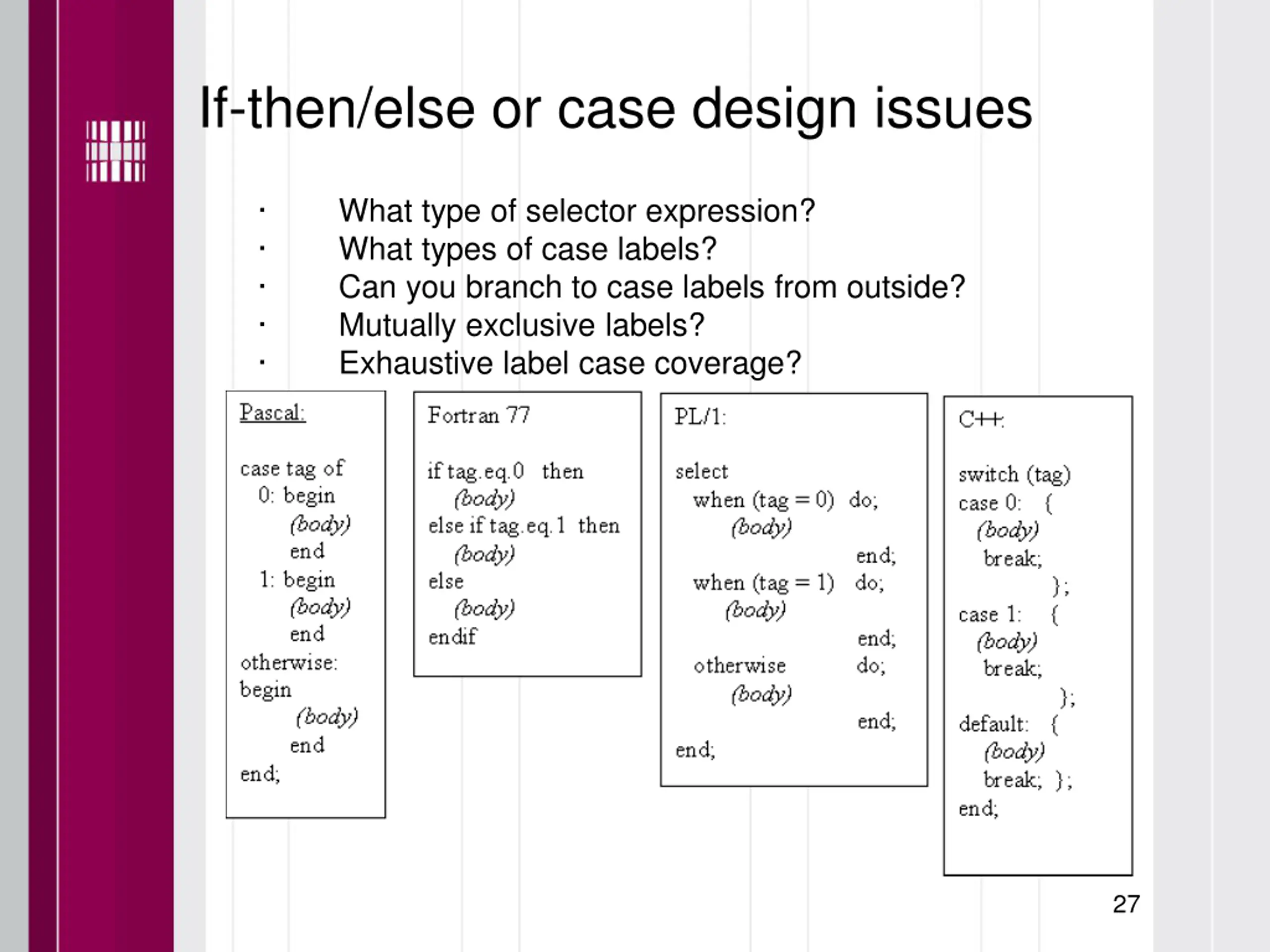 If-then/else or case design issues What type of selector expression? What types of case labels? Can you branch to case labels from outside? Mutually exclusive labels? Exhaustive label case coverage? 27