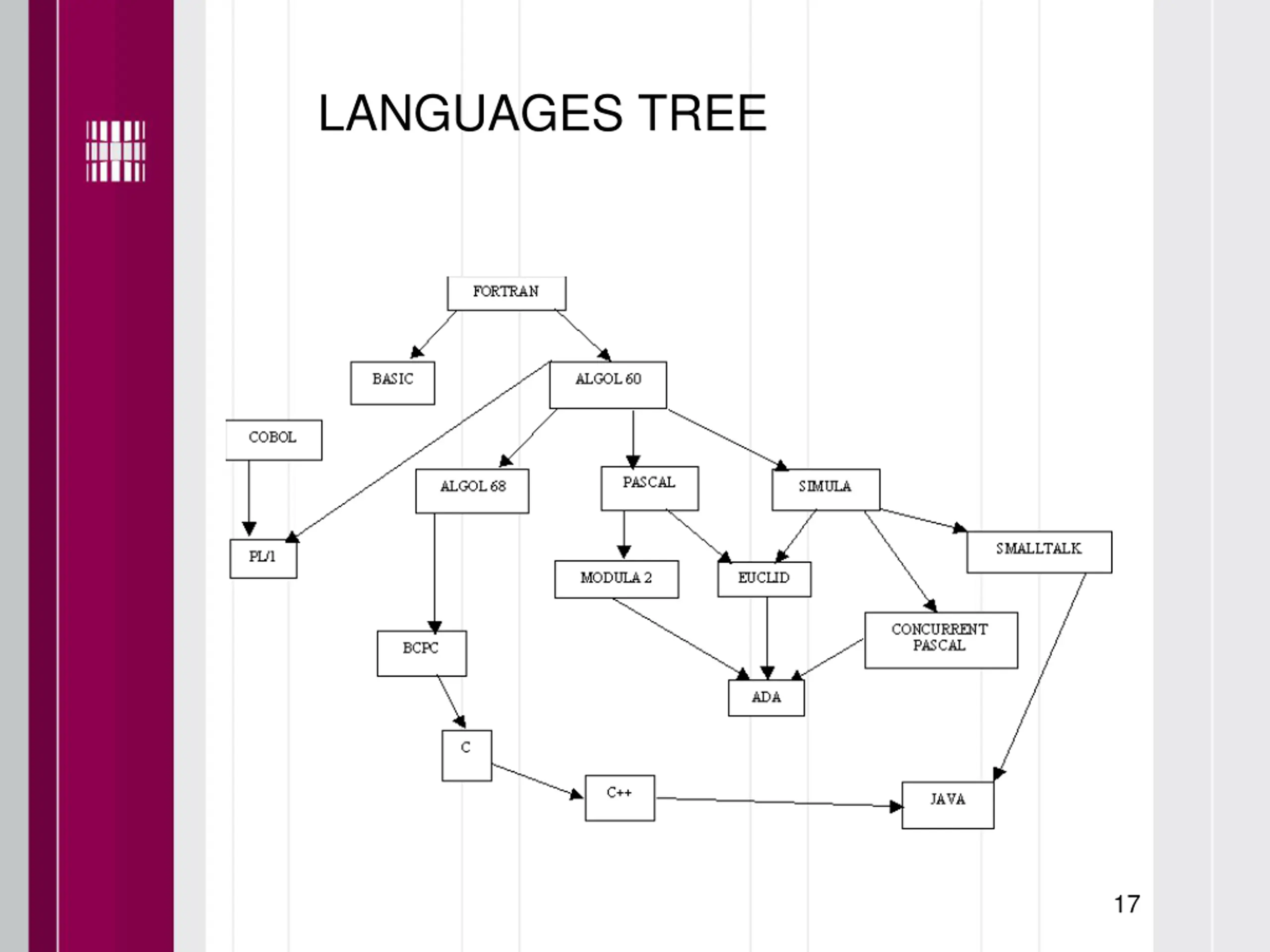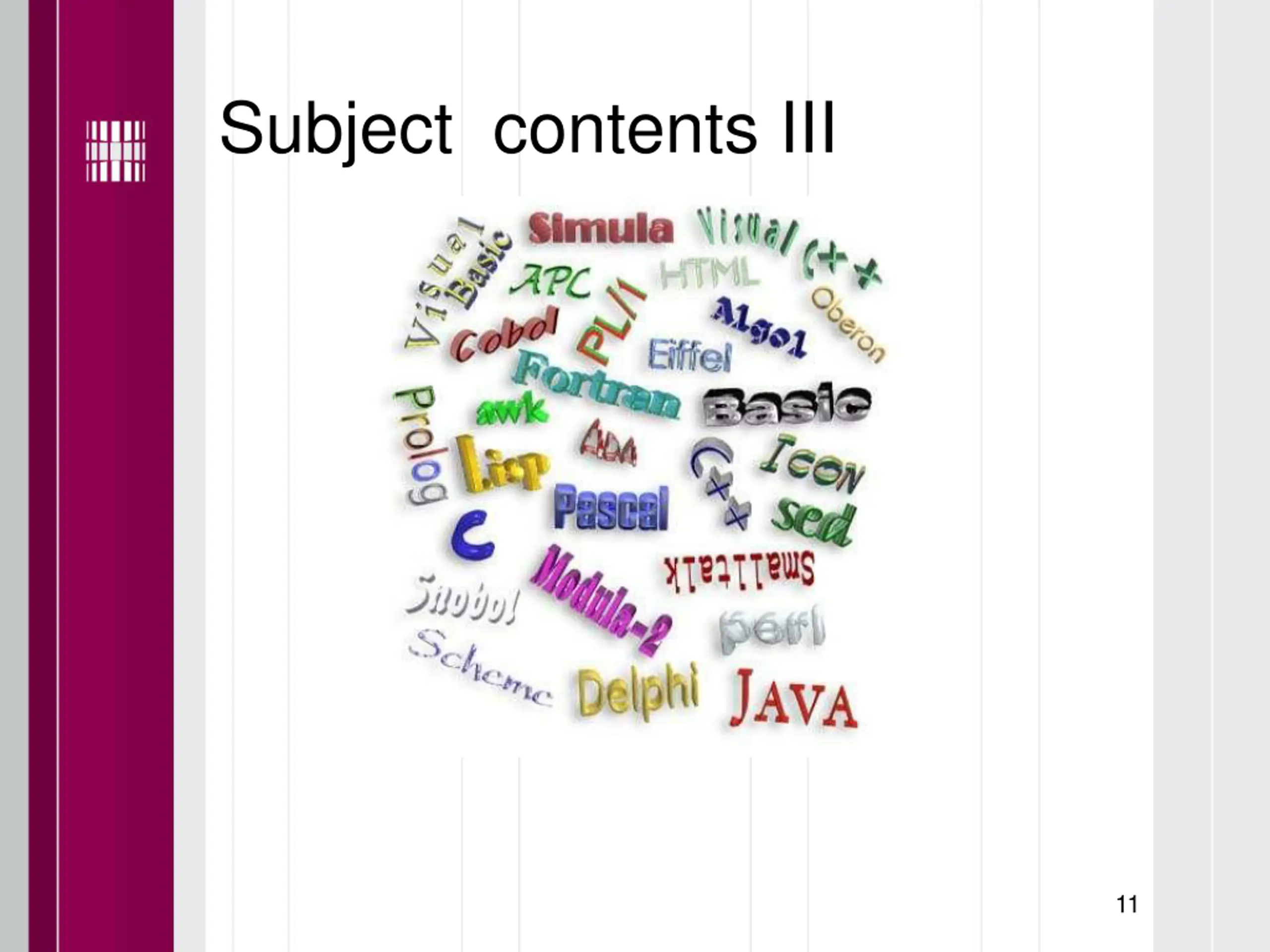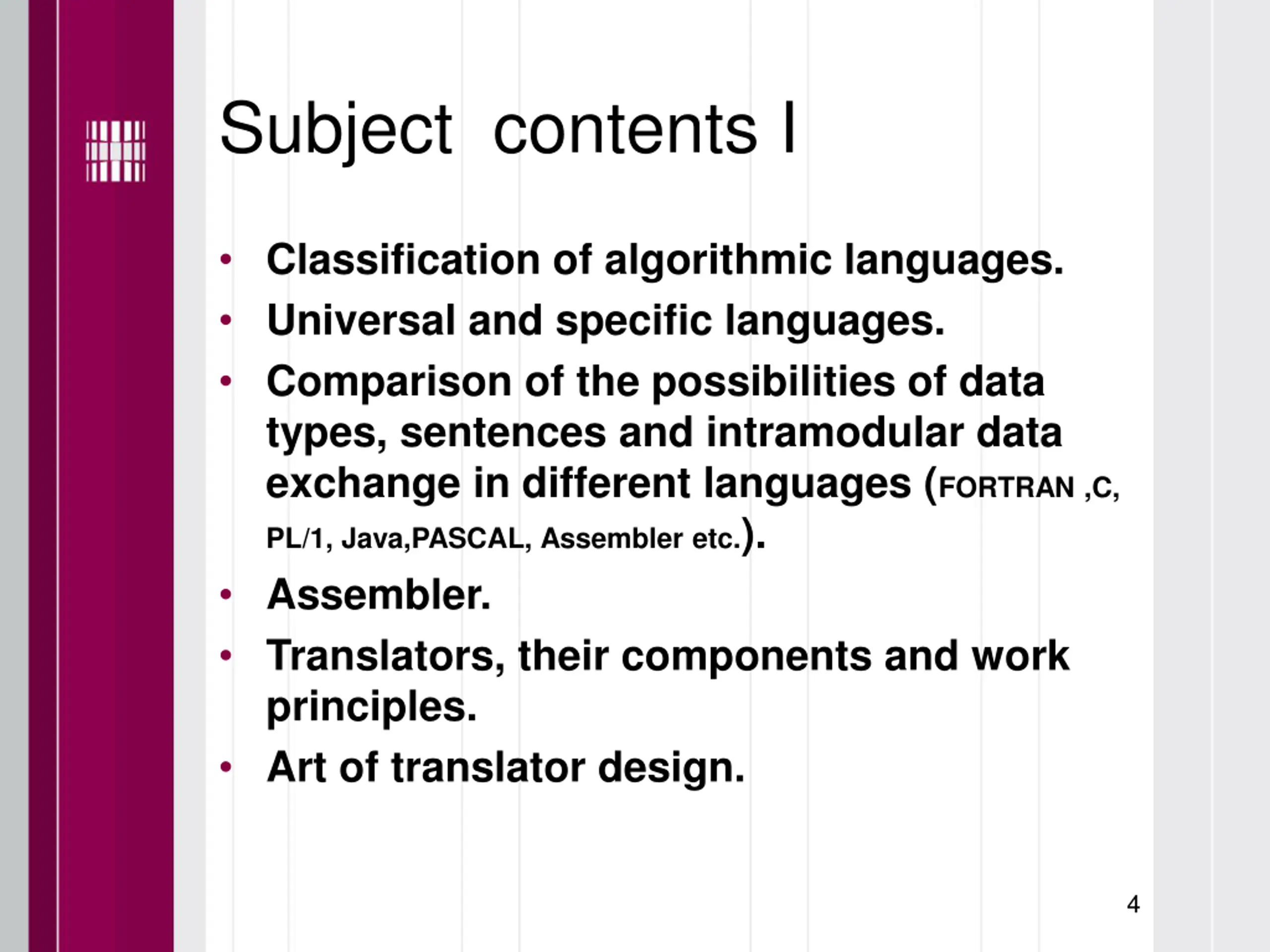 Subject contents I Classification of algorithmic languages. Universal and specific languages. Comparison of the possibilities of data types, sentences and intramodular data exchange in different languages (FORTRAN ,C, PL/1, Java,PASCAL, Assembler etc.). Assembler. Translators, their components and work principles. Art of translator design. 4