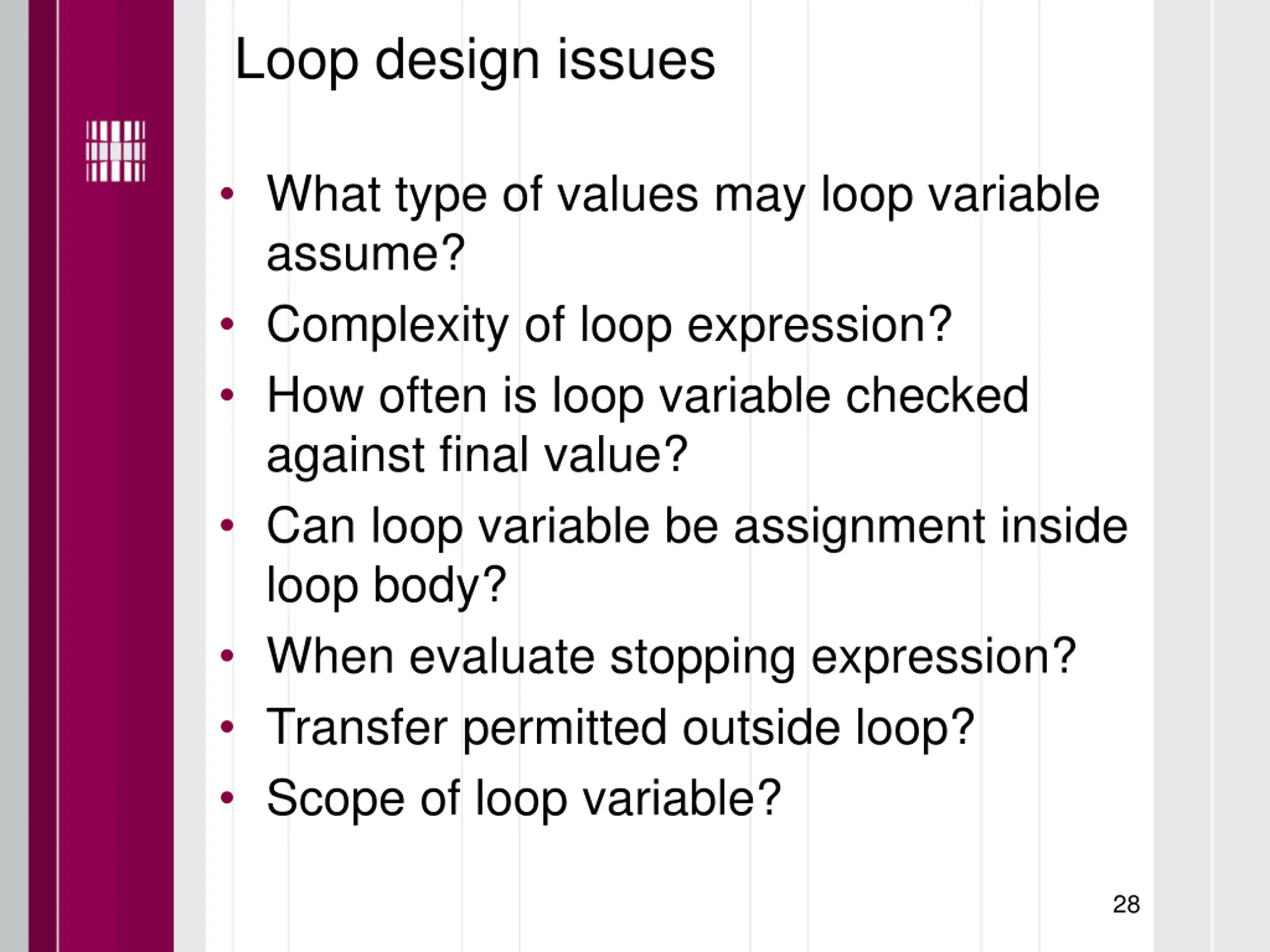 Loop design issues What type of values may loop variable assume? Complexity of loop expression? How often is loop variable checked against final value? Can loop variable be assignment inside loop body? When evaluate stopping expression? Transfer permitted outside loop? Scope of loop variable? 28