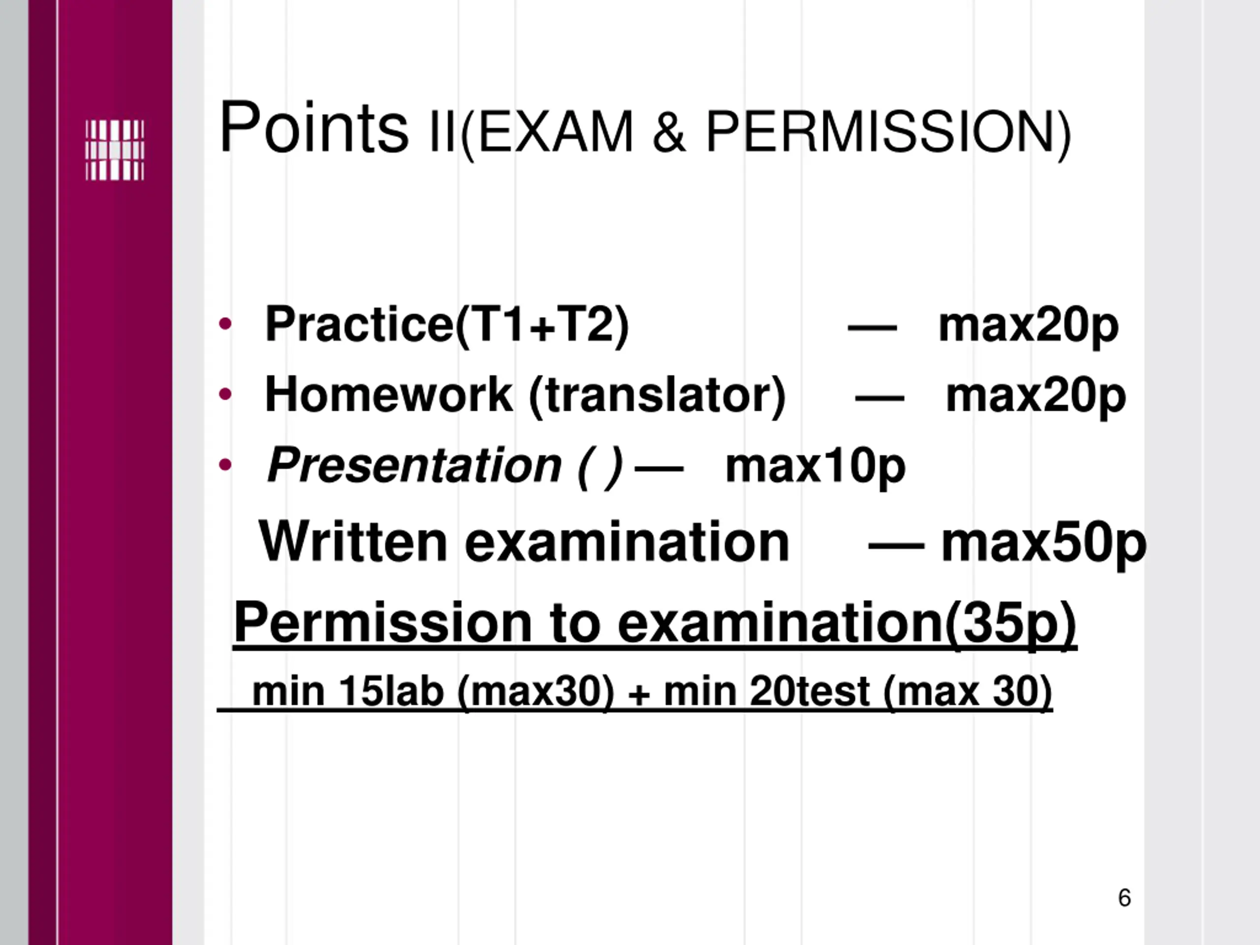 Points II(EXAM & PERMISSION) Practice(T1+T2) max20p Homework (translator) max20p Presentation ( ) max10p Written examination Permission to examination(35p) min 15lab (max30) + min 20test (max 30) max50p 6