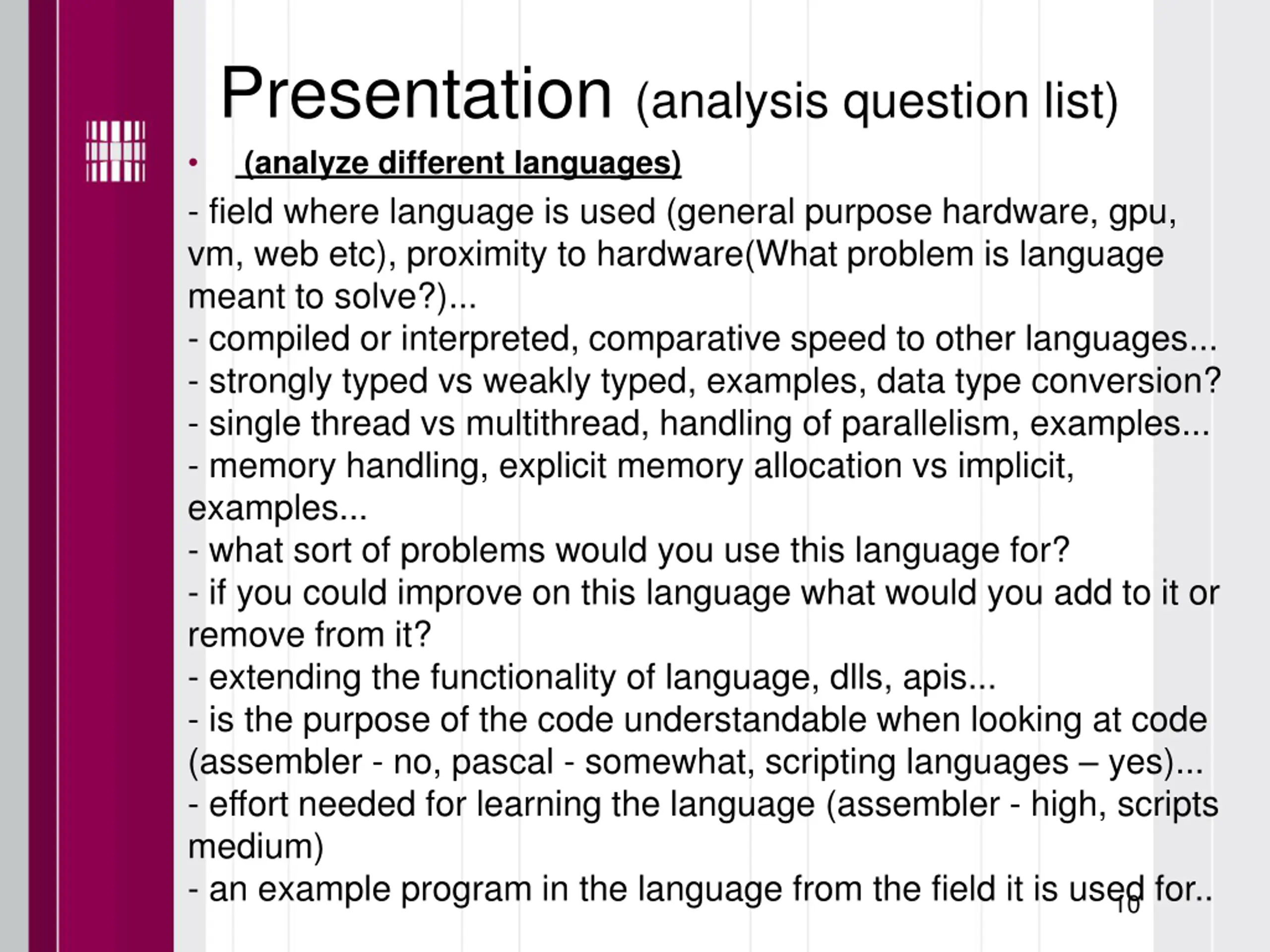 Presentation (analysis question list) (analyze different languages) - field where language is used (general purpose hardware, gpu, vm, web etc), proximity to hardware(What problem is language meant to solve?)... - compiled or interpreted, comparative speed to other languages... - strongly typed vs weakly typed, examples, data type conversion? - single thread vs multithread, handling of parallelism, examples... - memory handling, explicit memory allocation vs implicit, examples... - what sort of problems would you use this language for? - if you could improve on this language what would you add to it or remove from it? - extending the functionality of language, dlls, apis... - is the purpose of the code understandable when looking at code (assembler - no, pascal - somewhat, scripting languages yes)... - effort needed for learning the language (assembler - high, scripts medium) - an example program in the language from the field it is used for.. 10