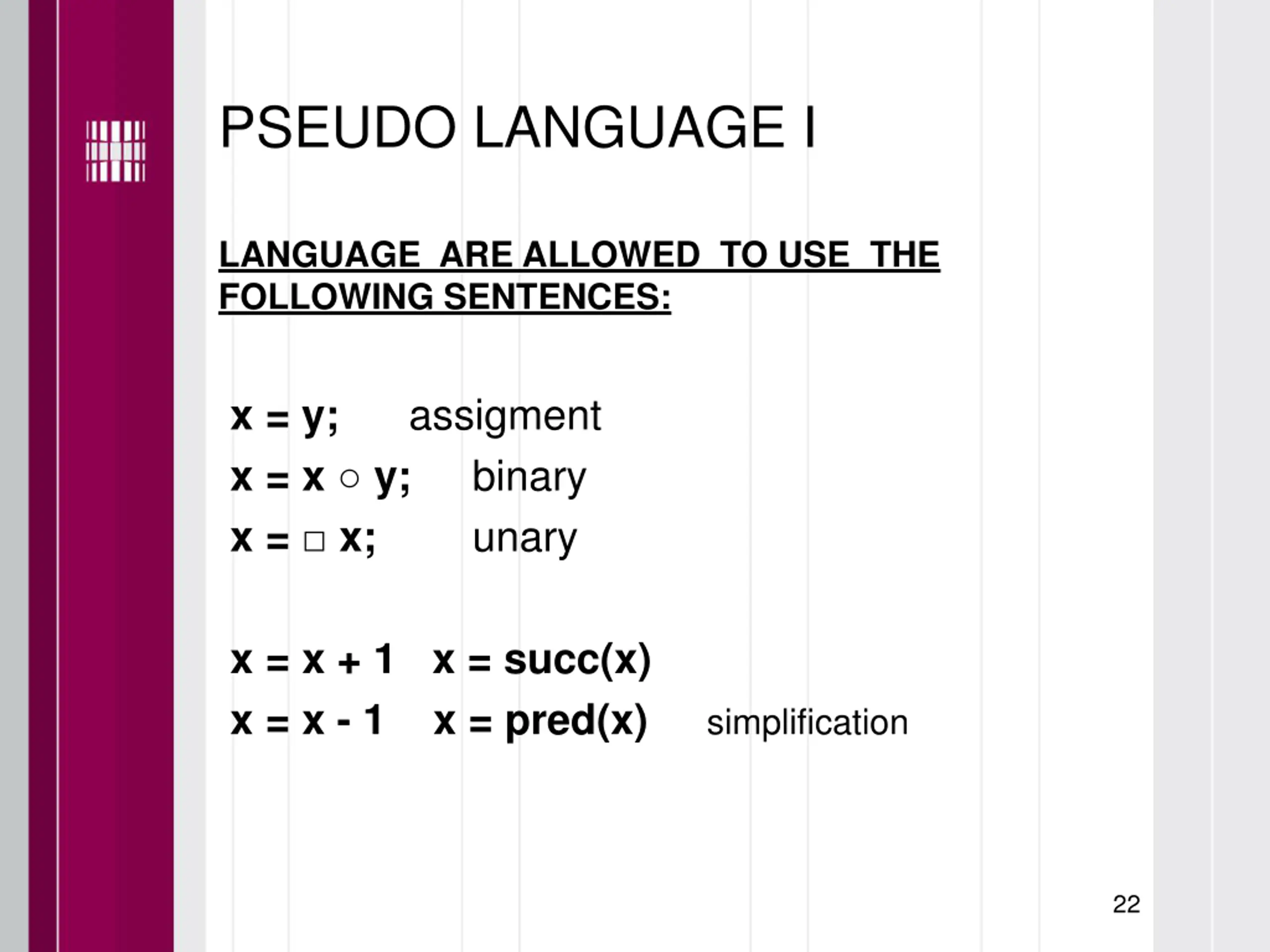 PSEUDO LANGUAGE I LANGUAGE ARE ALLOWED TO USE THE FOLLOWING SENTENCES: assigment binary unary x = y; x = x y; x = x; x = x + 1 x = succ(x) x = x - 1 x = pred(x) simplification 22