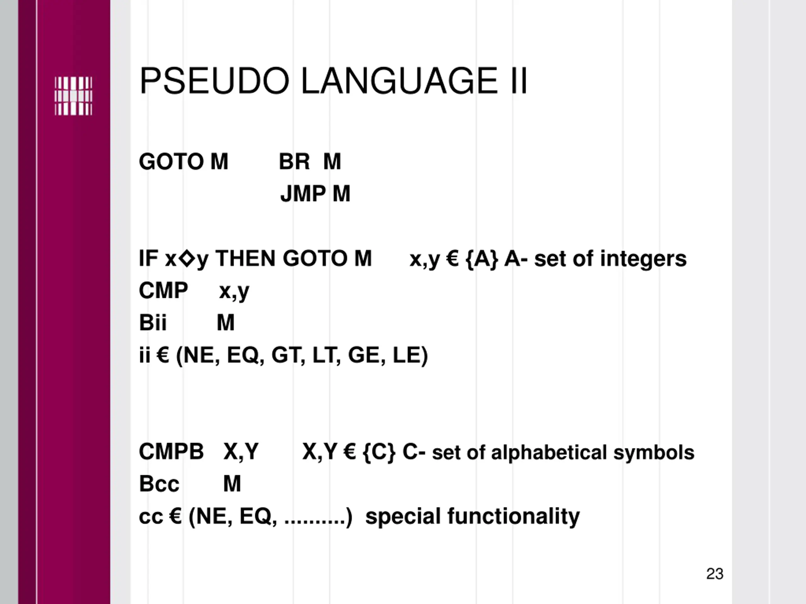 PSEUDO LANGUAGE II GOTO M BR M JMP M IF x y THEN GOTO M x,y {A} A- set of integers CMP x,y Bii M ii (NE, EQ, GT, LT, GE, LE) CMPB X,Y X,Y {C} C- set of alphabetical symbols Bcc M cc (NE, EQ, ..........) special functionality 23