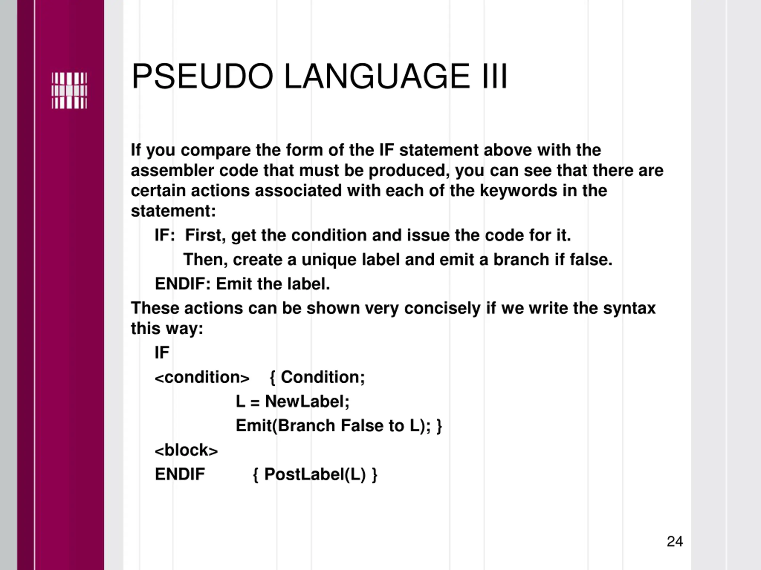 PSEUDO LANGUAGE III If you compare the form of the IF statement above with the assembler code that must be produced, you can see that there are certain actions associated with each of the keywords in the statement: IF: First, get the condition and issue the code for it. Then, create a unique label and emit a branch if false. ENDIF: Emit the label. These actions can be shown very concisely if we write the syntax this way: IF <condition> { Condition; L = NewLabel; Emit(Branch False to L); } <block> ENDIF { PostLabel(L) } 24