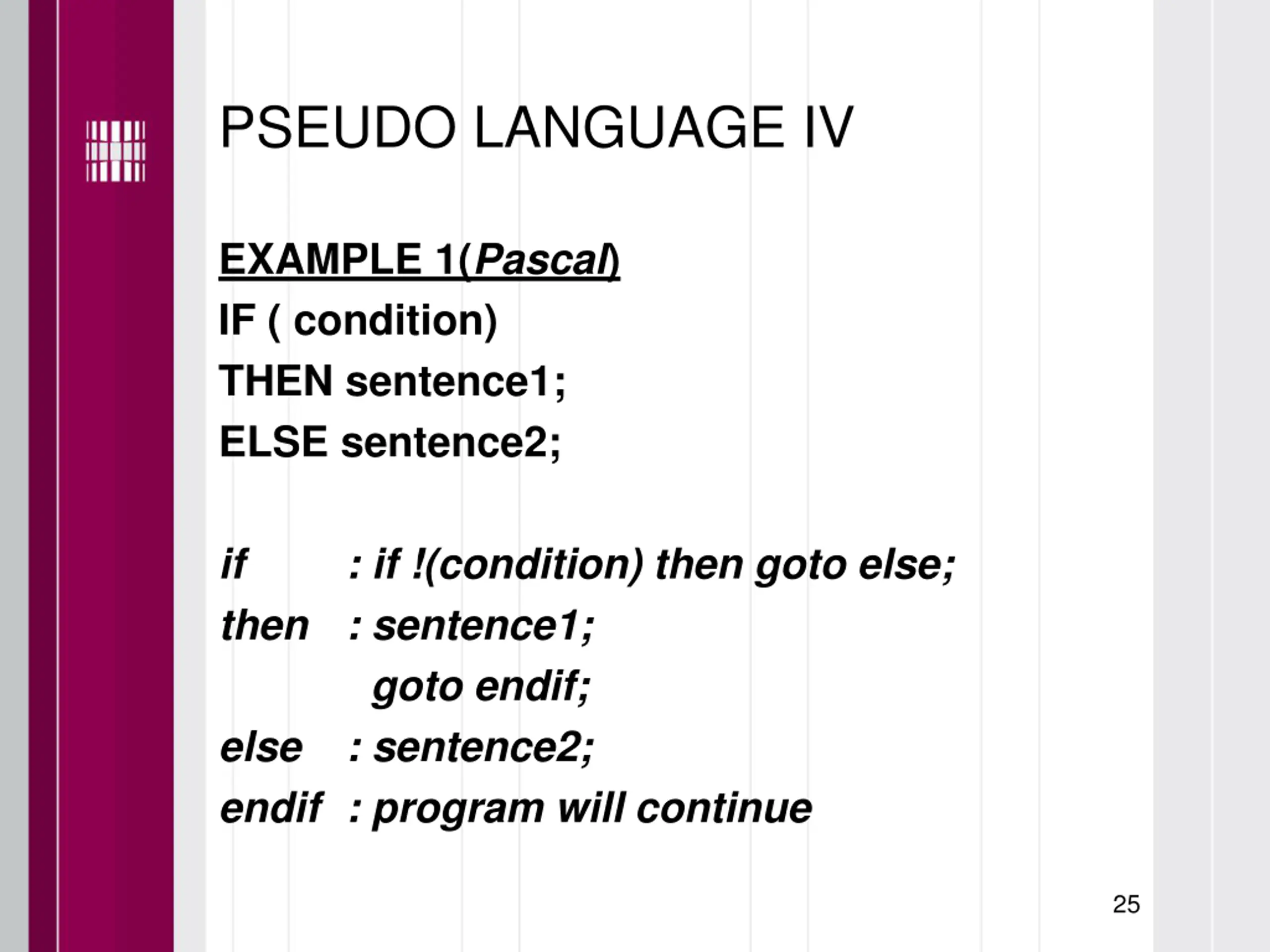 PSEUDO LANGUAGE IV EXAMPLE 1(Pascal) IF ( condition) THEN sentence1; ELSE sentence2; if then : sentence1; goto endif; else : sentence2; endif : program will continue : if !(condition) then goto else; 25