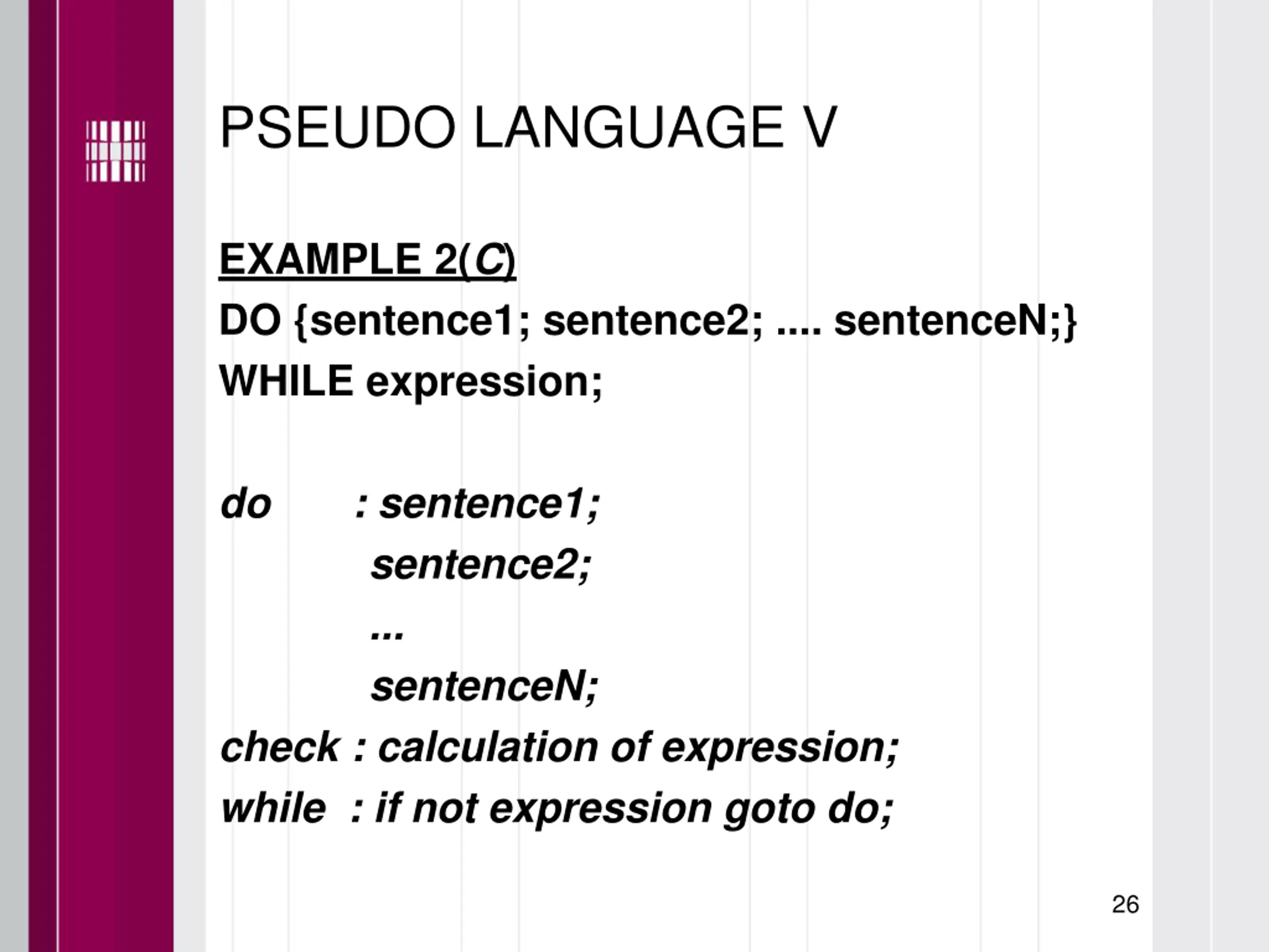 PSEUDO LANGUAGE V EXAMPLE 2(C) DO {sentence1; sentence2; .... sentenceN;} WHILE expression; do : sentence1; sentence2; ... sentenceN; check : calculation of expression; while : if not expression goto do; 26