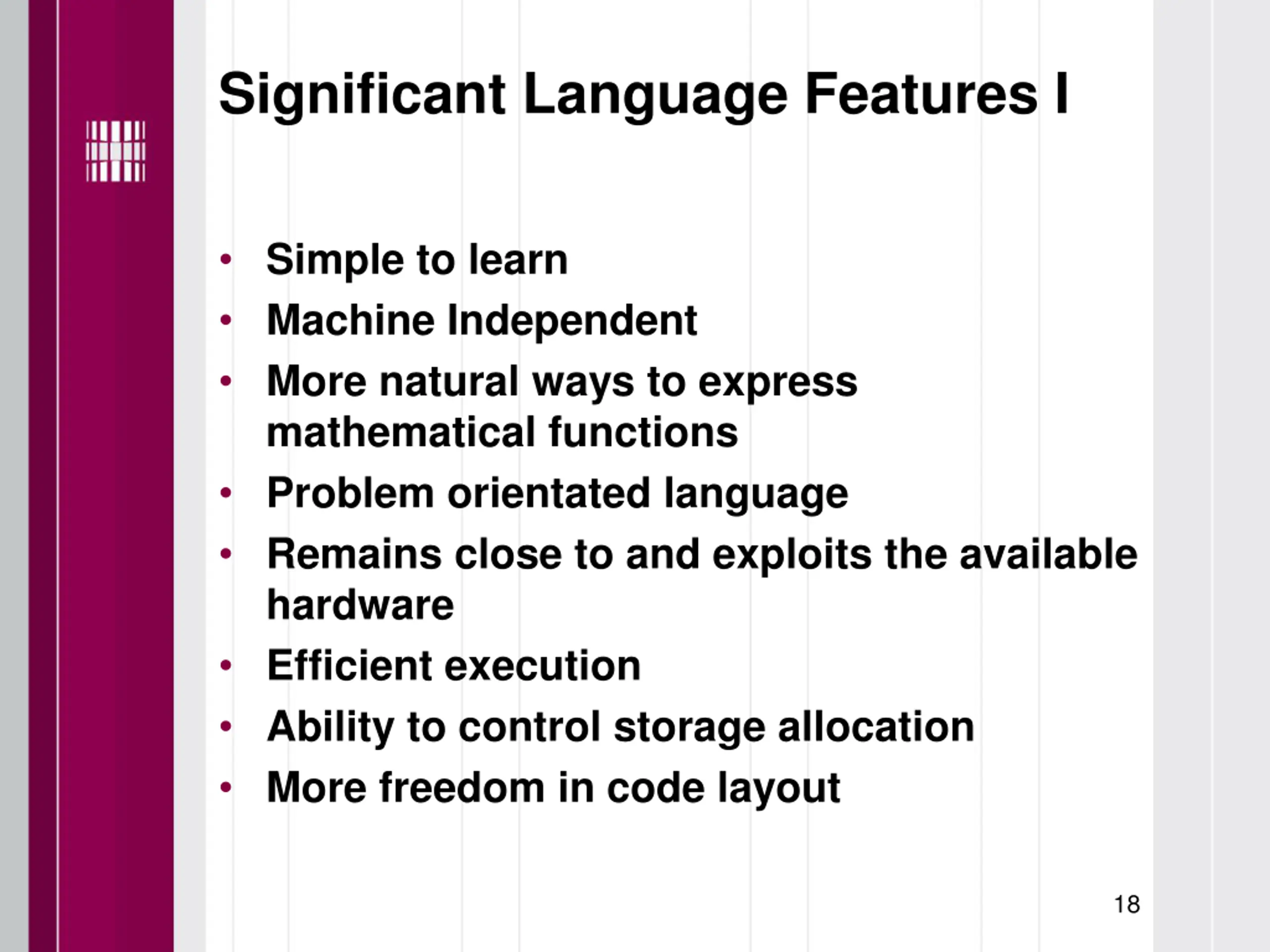 Significant Language Features I Simple to learn Machine Independent More natural ways to express mathematical functions Problem orientated language Remains close to and exploits the available hardware Efficient execution Ability to control storage allocation More freedom in code layout 18