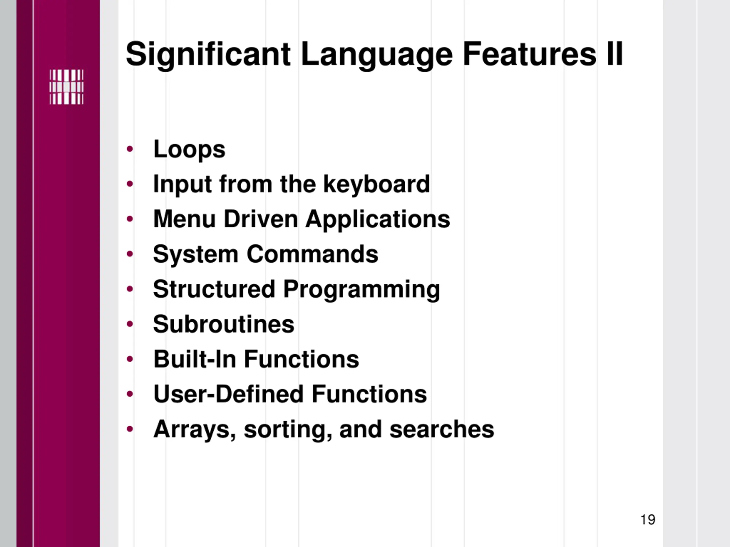 Significant Language Features II Loops Input from the keyboard Menu Driven Applications System Commands Structured Programming Subroutines Built-In Functions User-Defined Functions Arrays, sorting, and searches 19