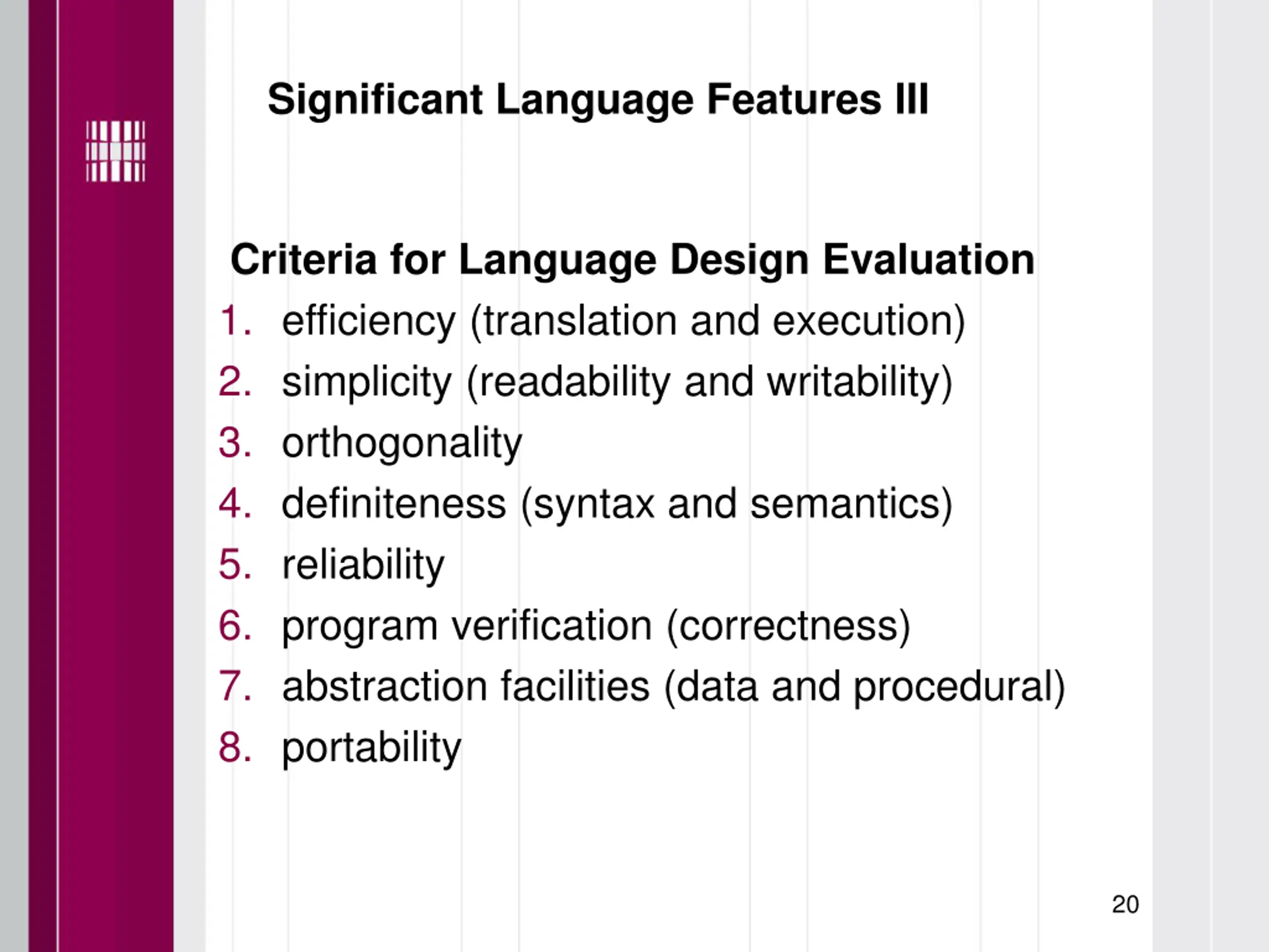 Significant Language Features III Criteria for Language Design Evaluation 1. efficiency (translation and execution) 2. simplicity (readability and writability) 3. orthogonality 4. definiteness (syntax and semantics) 5. reliability 6. program verification (correctness) 7. abstraction facilities (data and procedural) 8. portability 20