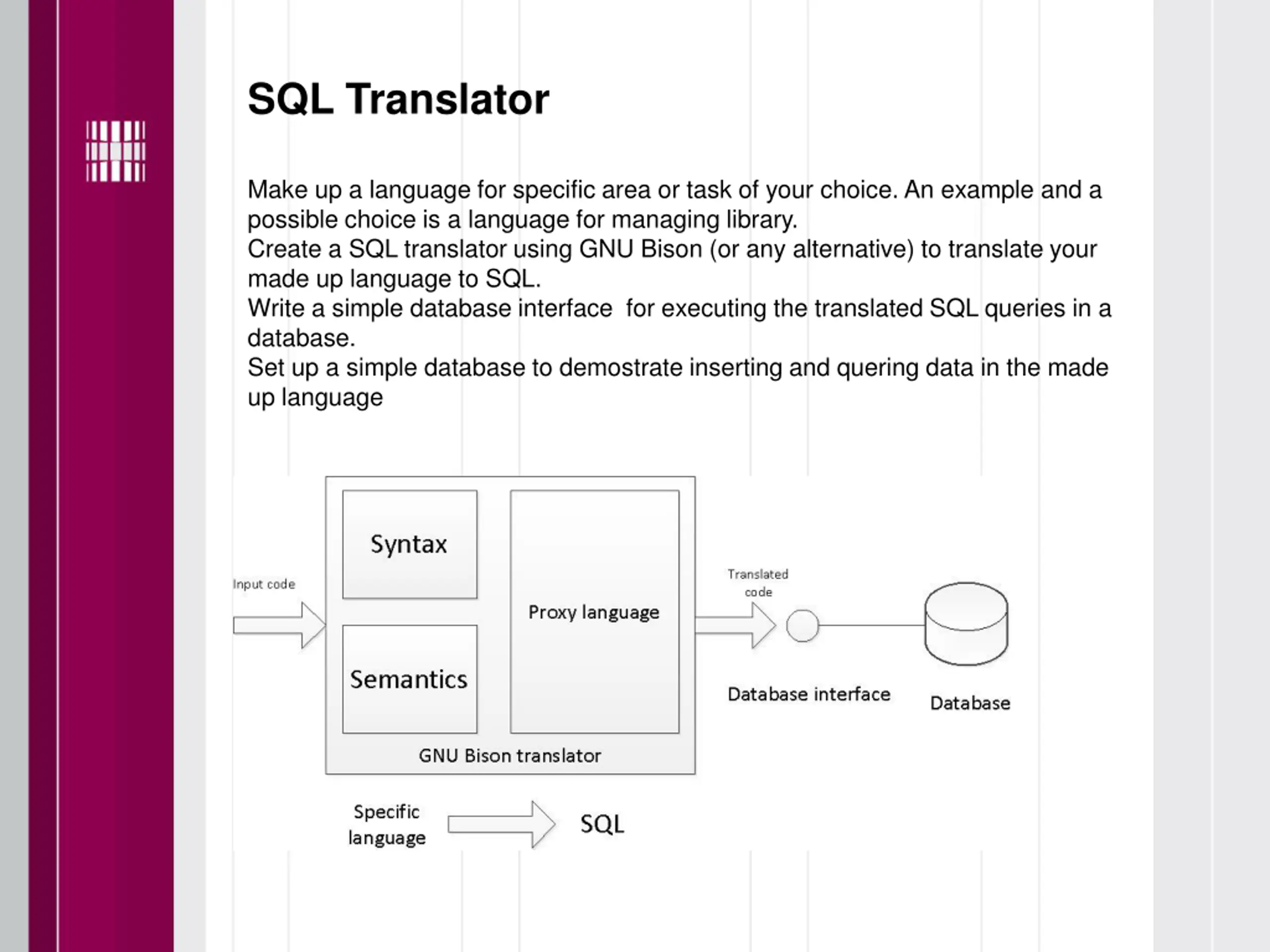 SQL Translator Make up a language for specific area or task of your choice. An example and a possible choice is a language for managing library. Create a SQL translator using GNU Bison (or any alternative) to translate your made up language to SQL. Write a simple database interface for executing the translated SQL queries in a database. Set up a simple database to demostrate inserting and quering data in the made up language
