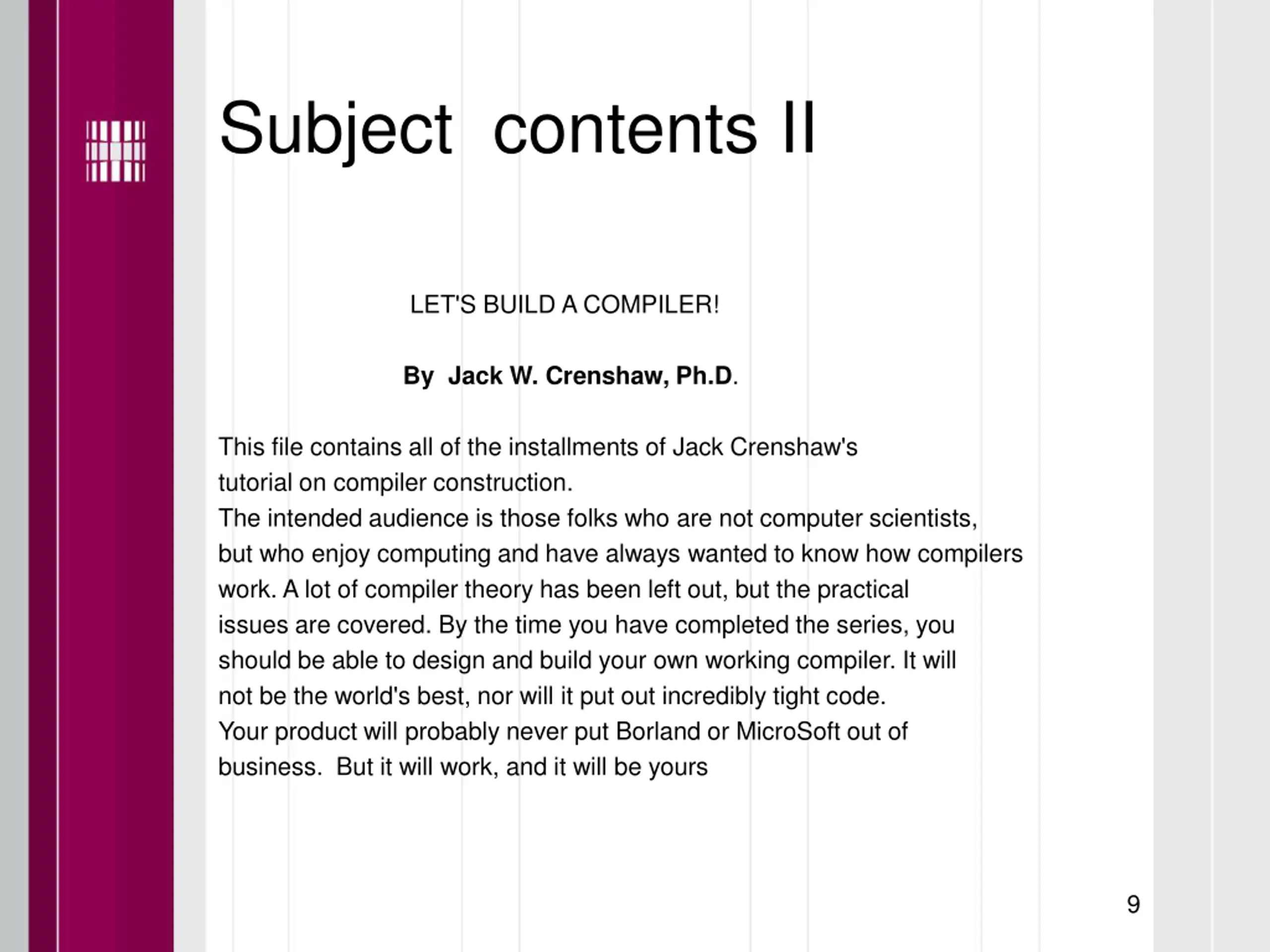 Subject contents II LET'S BUILD A COMPILER! By Jack W. Crenshaw, Ph.D. This file contains all of the installments of Jack Crenshaw's tutorial on compiler construction. The intended audience is those folks who are not computer scientists, but who enjoy computing and have always wanted to know how compilers work. A lot of compiler theory has been left out, but the practical issues are covered. By the time you have completed the series, you should be able to design and build your own working compiler. It will not be the world's best, nor will it put out incredibly tight code. Your product will probably never put Borland or MicroSoft out of business. But it will work, and it will be yours 9
