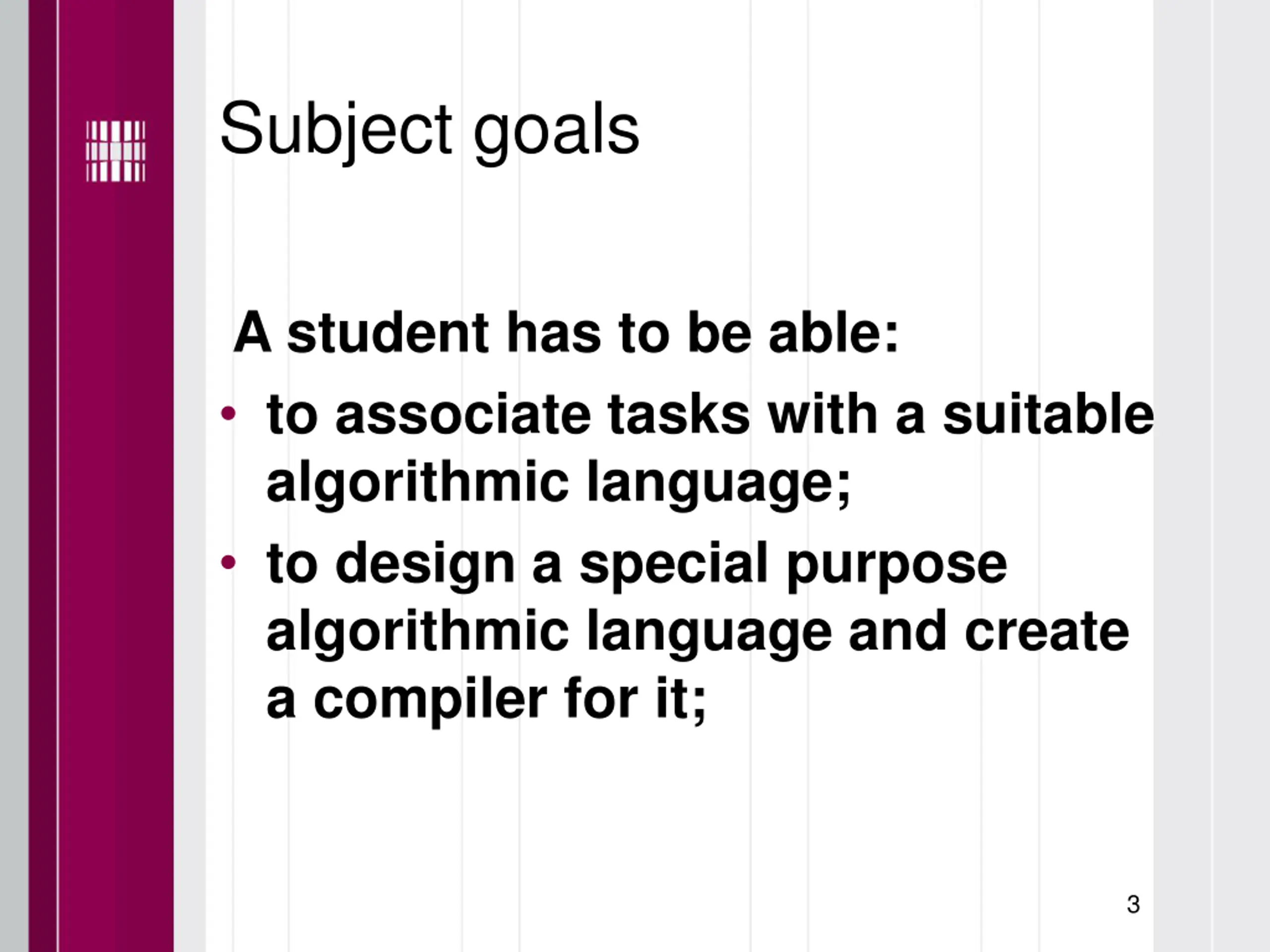 Subject goals A student has to be able: to associate tasks with a suitable algorithmic language; to design a special purpose algorithmic language and create a compiler for it; 3