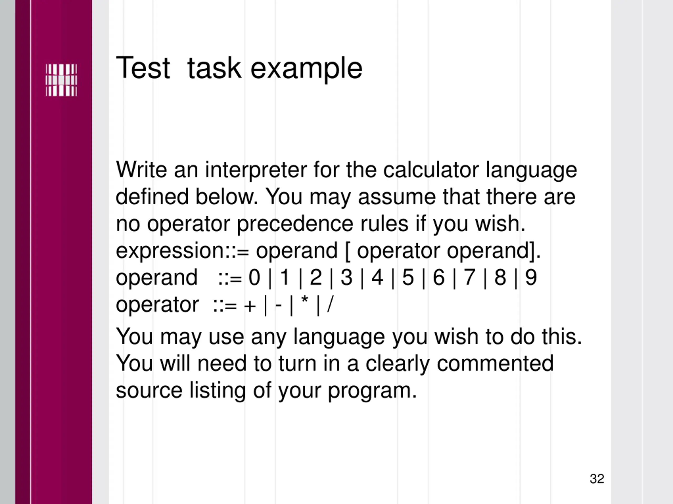 Test task example Write an interpreter for the calculator language defined below. You may assume that there are no operator precedence rules if you wish. expression::= operand [ operator operand]. operand ::= 0 | 1 | 2 | 3 | 4 | 5 | 6 | 7 | 8 | 9 operator ::= + | - | * | / You may use any language you wish to do this. You will need to turn in a clearly commented source listing of your program. 32