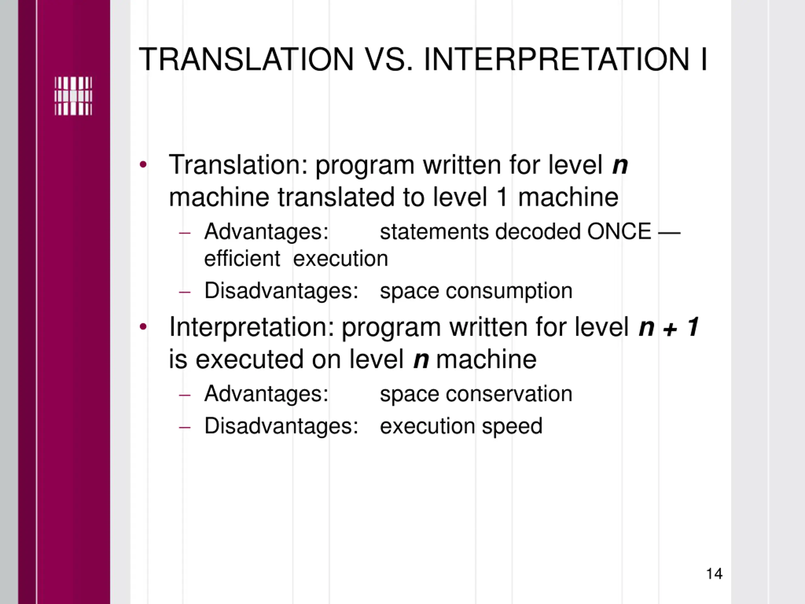 TRANSLATION VS. INTERPRETATION I Translation: program written for level n machine translated to level 1 machine Advantages: statements decoded ONCE efficient execution Disadvantages: space consumption Interpretation: program written for level n + 1 is executed on level n machine Advantages: space conservation Disadvantages: execution speed 14