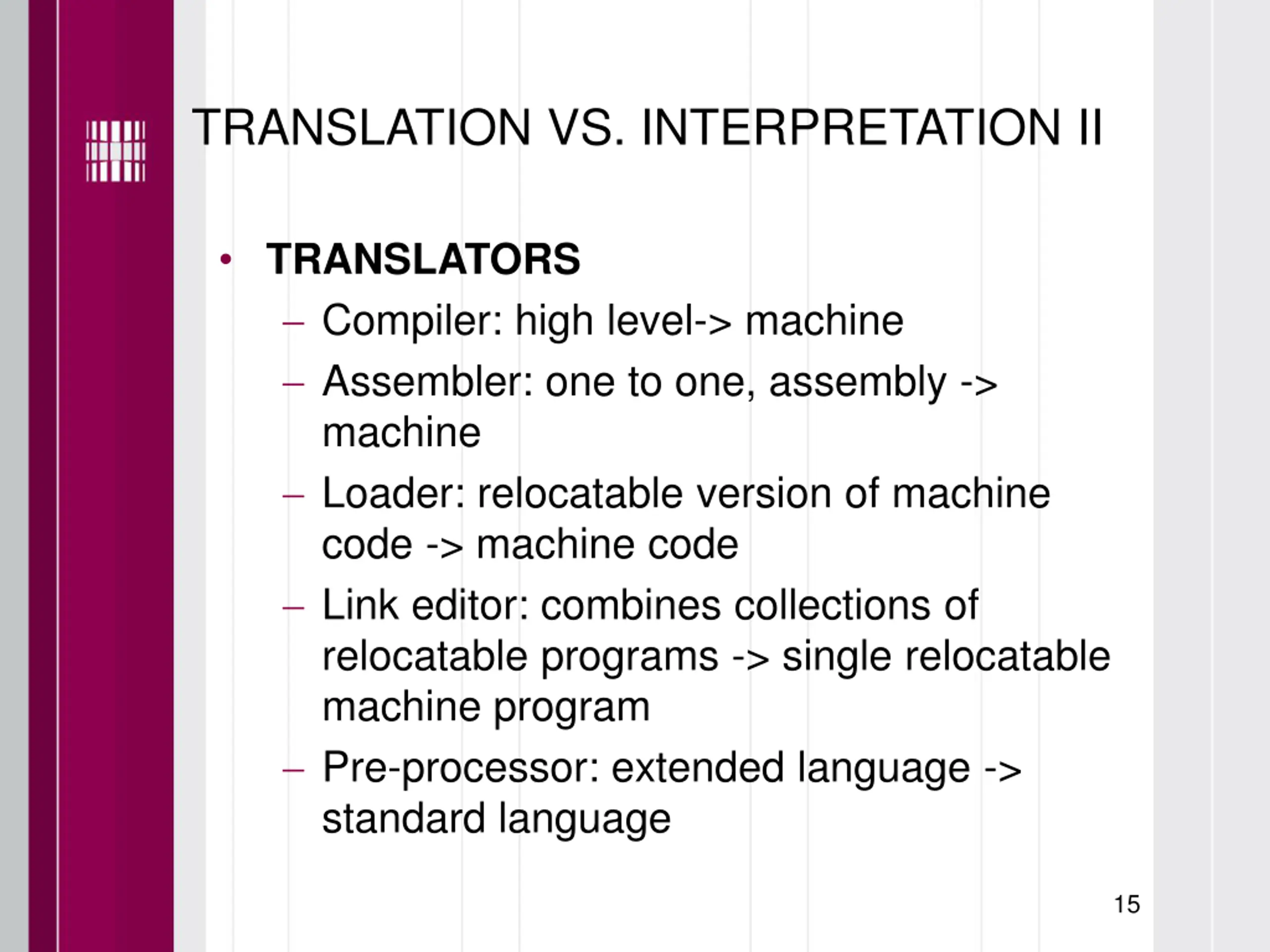 TRANSLATION VS. INTERPRETATION II TRANSLATORS Compiler: high level-> machine Assembler: one to one, assembly -> machine Loader: relocatable version of machine code -> machine code Link editor: combines collections of relocatable programs -> single relocatable machine program Pre-processor: extended language -> standard language 15