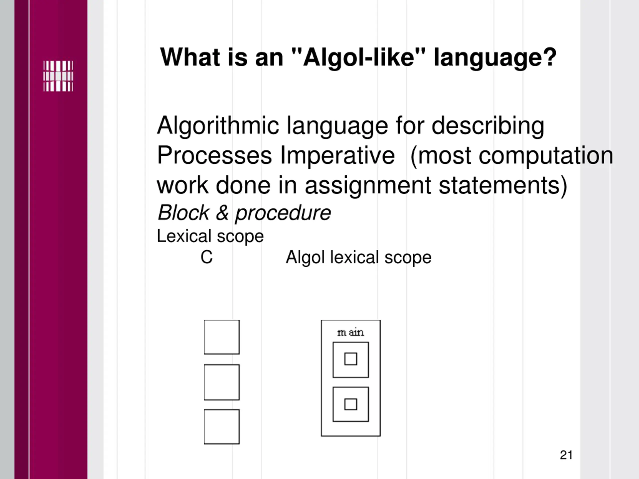 What is an "Algol-like" language? Algorithmic language for describing Processes Imperative (most computation work done in assignment statements) Block & procedure Lexical scope C Algol lexical scope 21