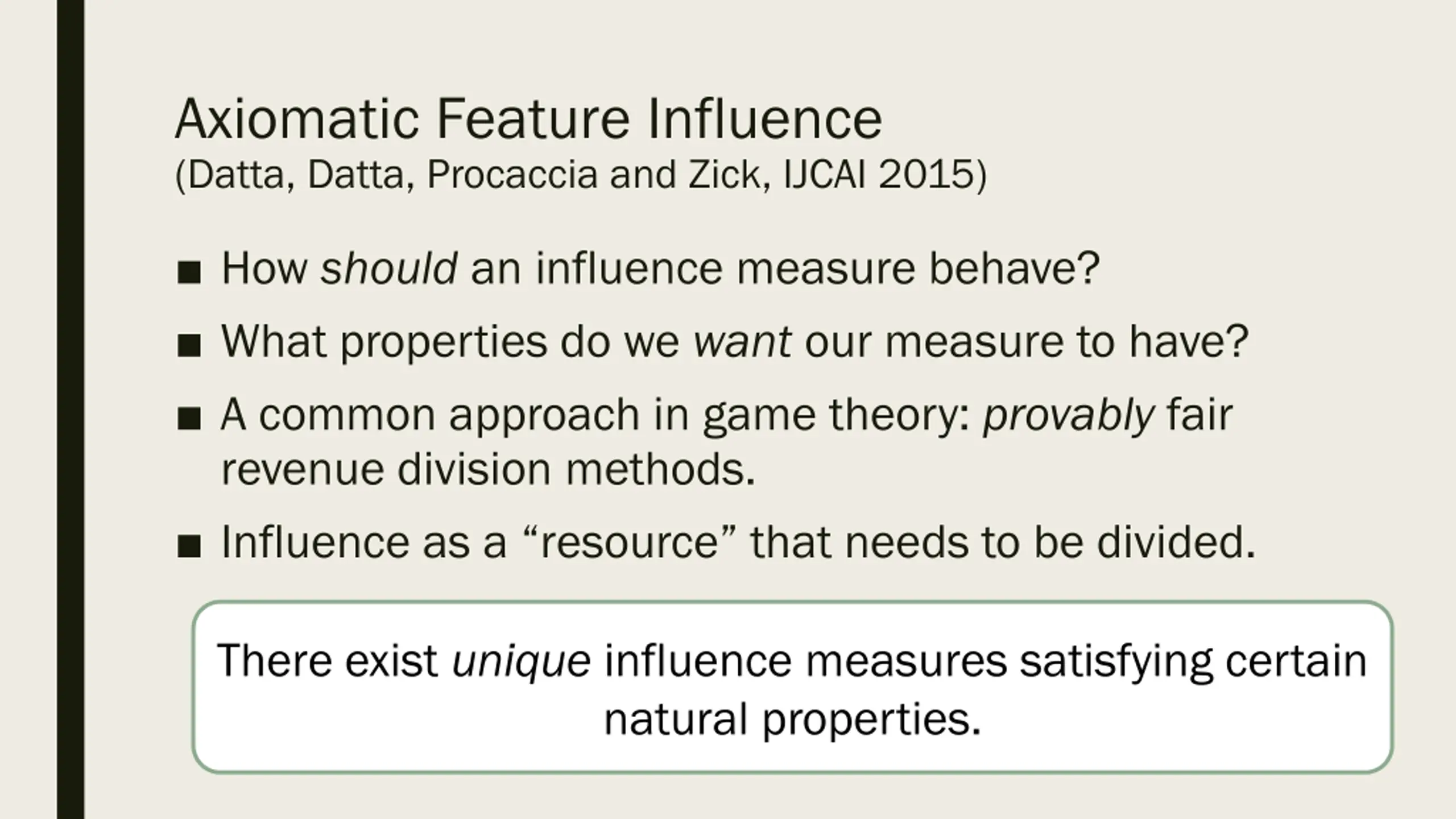 Axiomatic Feature Influence (Datta, Datta, Procaccia and Zick, IJCAI 2015) How should an influence measure behave? What properties do we want our measure to have? A common approach in game theory: provably fair revenue division methods. Influence as a resource that needs to be divided. There exist unique influence measures satisfying certain natural properties.