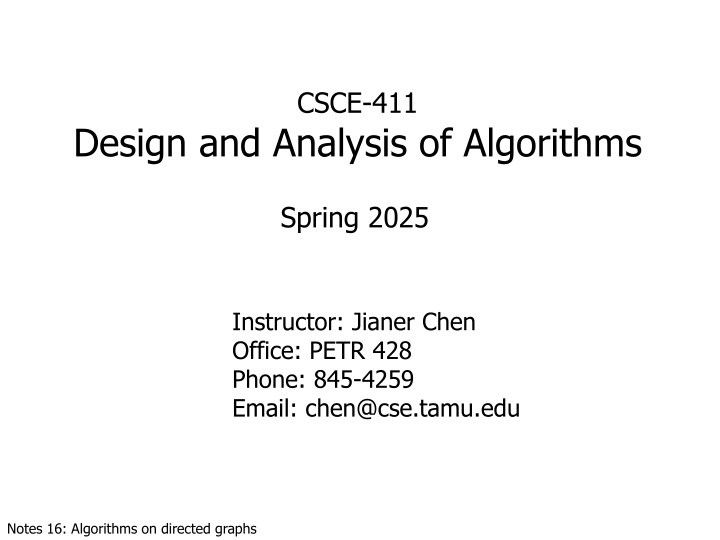 CSCE-411 Design and Analysis of Algorithms Spring 2025 Instructor: Jianer Chen Office: PETR 428 Phone: 845-4259 Email: chen@cse.tamu.edu Notes 16: Algorithms on directed graphs