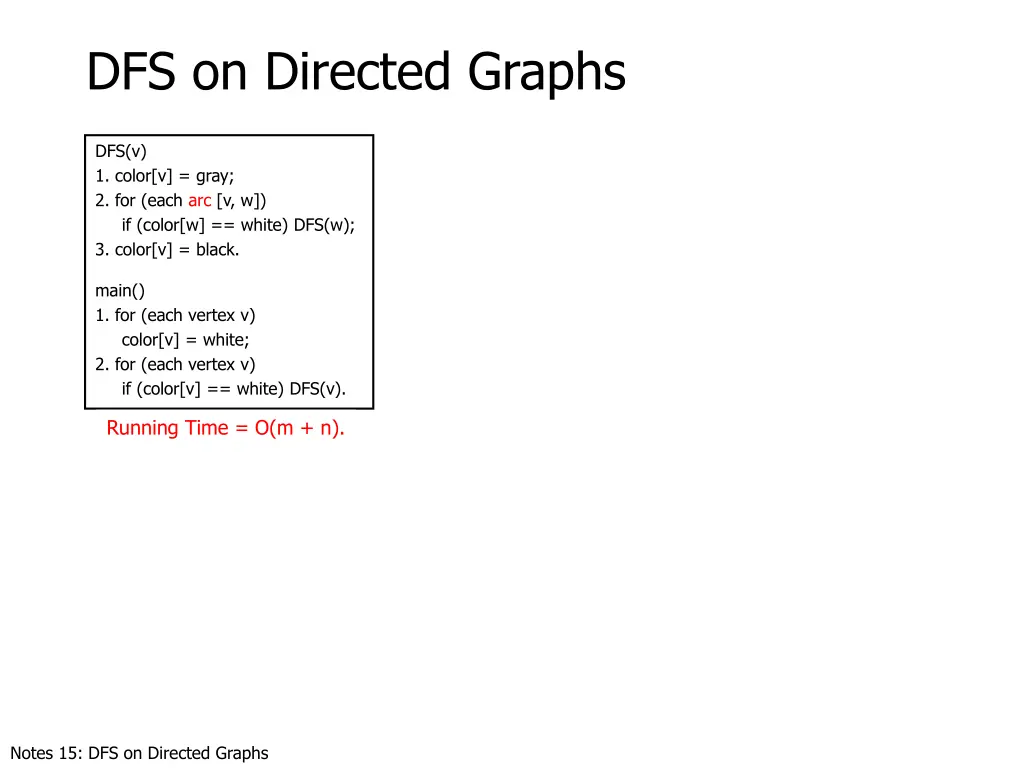 DFS on Directed Graphs DFS(v) 1. color[v] = gray; 2. for (each edge [v, w]) if (color[w] == white) DFS(w); 3. color[v] = black. main() 1. for (each vertex v) color[v] = white; 2. for (each vertex v) if (color[v] == white) DFS(v). Running Time = O(m + n). Notes 15: DFS on Directed Graphs