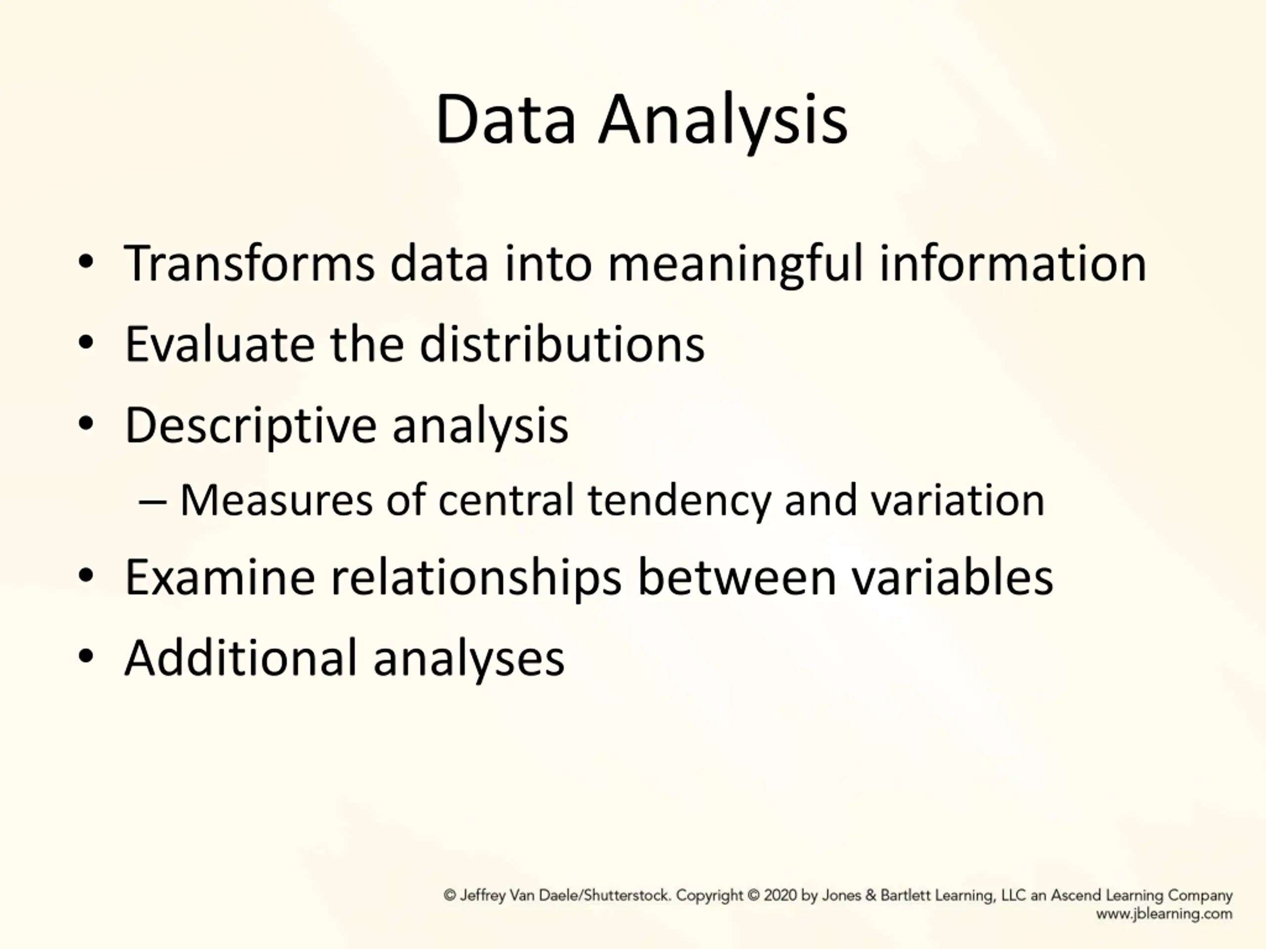Data Analysis Transforms data into meaningful information Evaluate the distributions Descriptive analysis Measures of central tendency and variation Examine relationships between variables Additional analyses