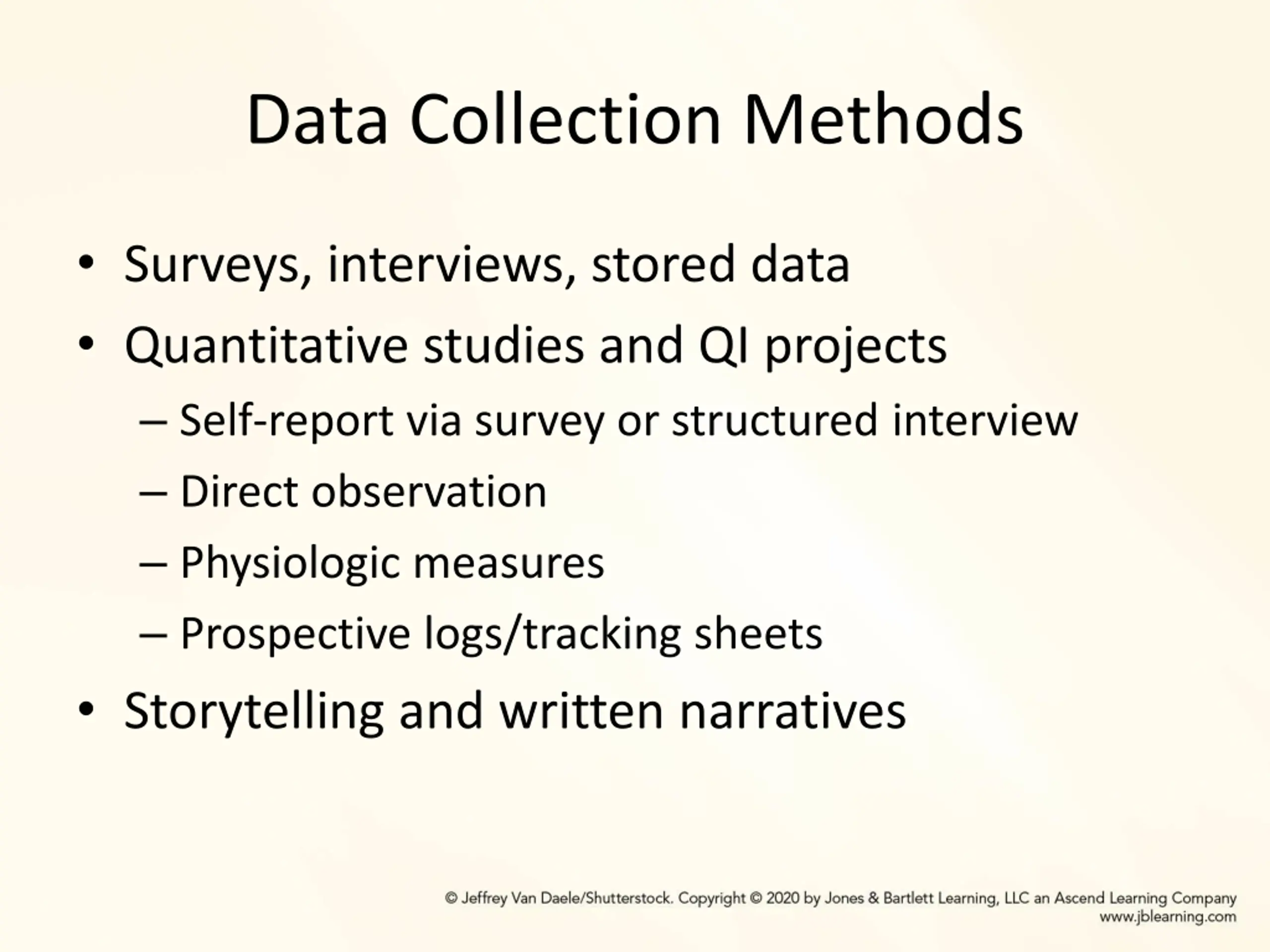 Data Collection Methods Surveys, interviews, stored data Quantitative studies and QI projects Self-report via survey or structured interview Direct observation Physiologic measures Prospective logs/tracking sheets Storytelling and written narratives