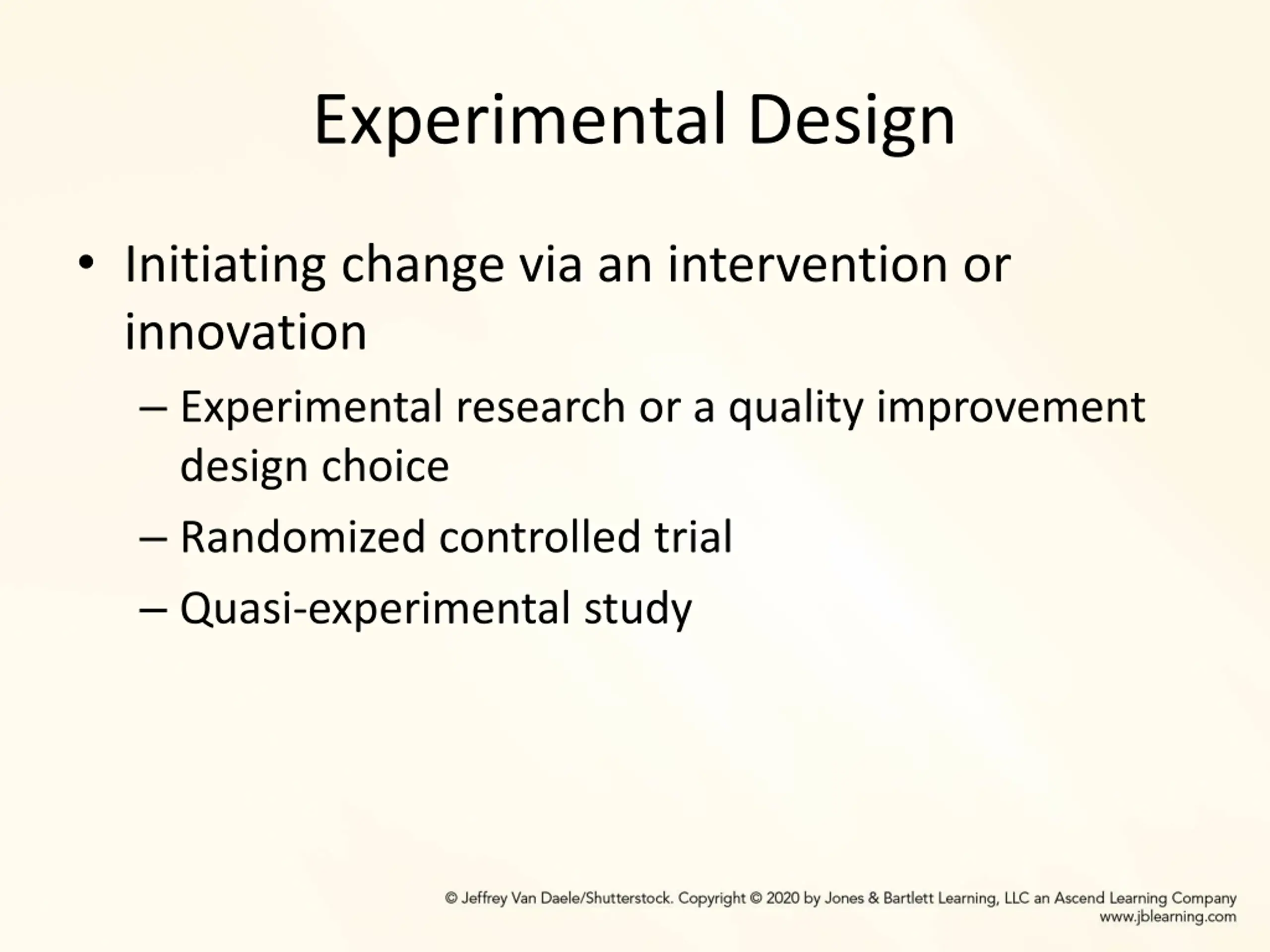 Experimental Design Initiating change via an intervention or innovation Experimental research or a quality improvement design choice Randomized controlled trial Quasi-experimental study