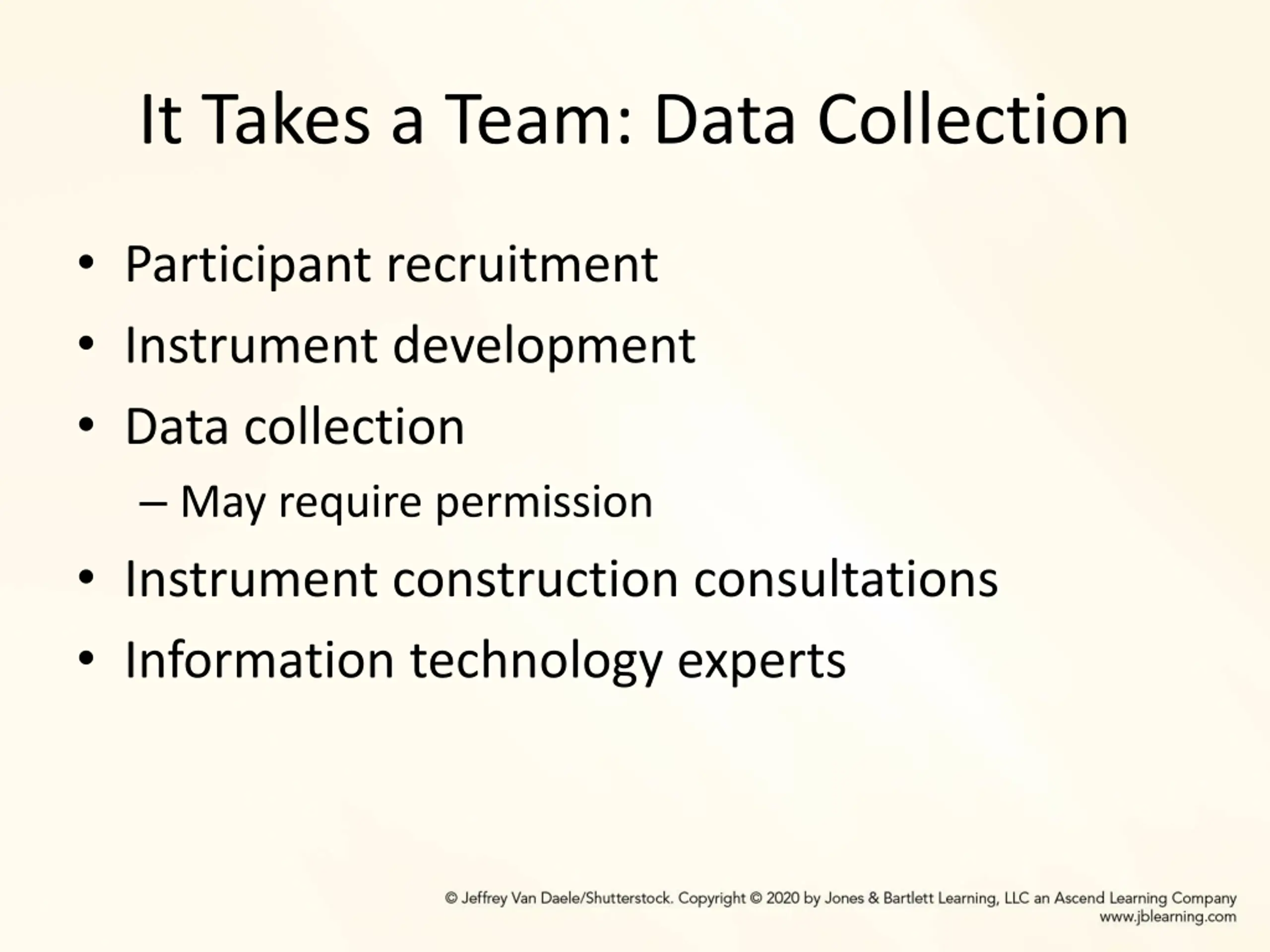It Takes a Team: Data Collection Participant recruitment Instrument development Data collection May require permission Instrument construction consultations Information technology experts