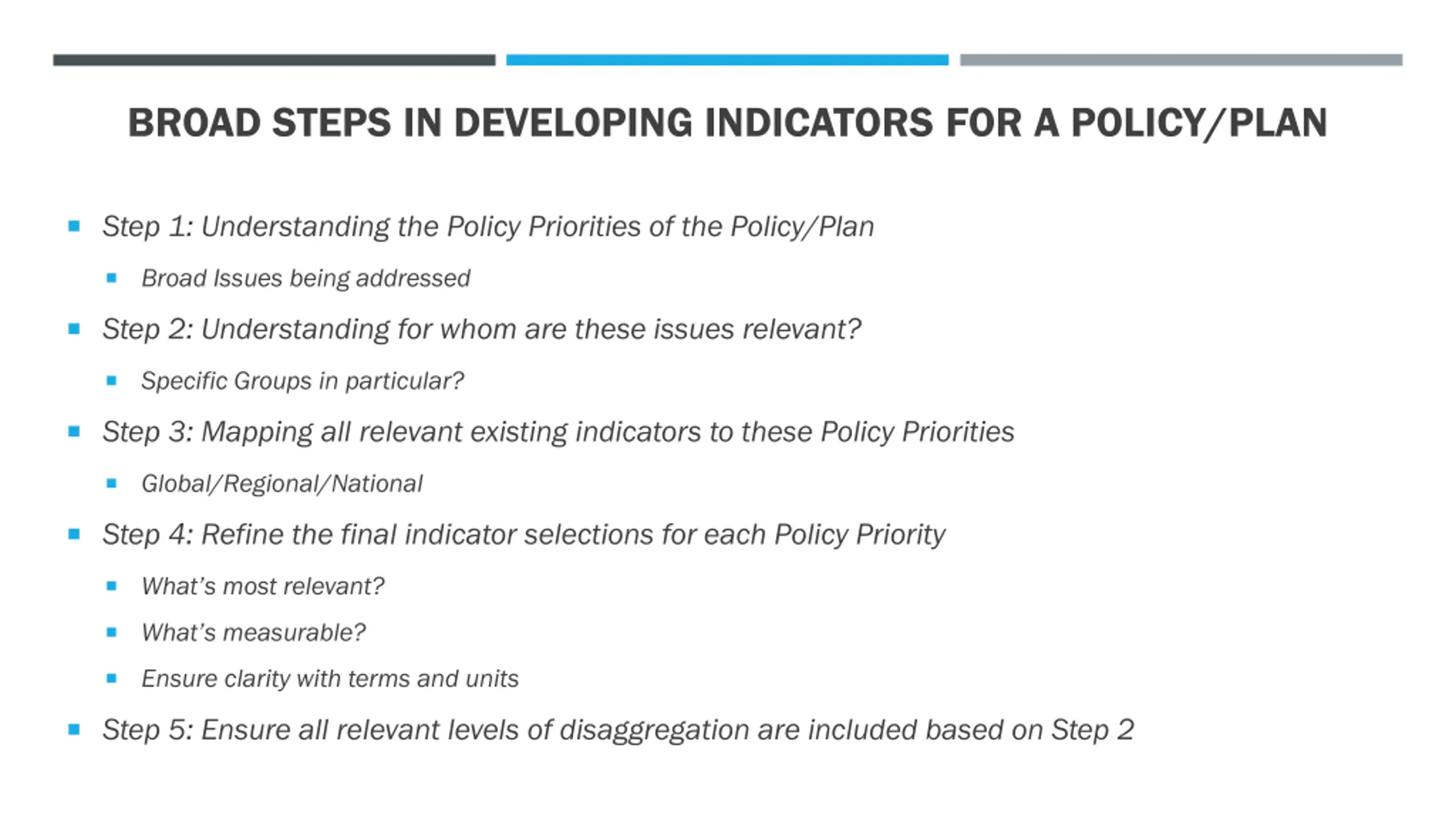 BROAD STEPS IN DEVELOPING INDICATORS FOR A POLICY/PLAN Step 1: Understanding the Policy Priorities of the Policy/Plan Broad Issues being addressed Step 2: Understanding for whom are these issues relevant? Specific Groups in particular? Step 3: Mapping all relevant existing indicators to these Policy Priorities Global/Regional/National Step 4: Refine the final indicator selections for each Policy Priority What s most relevant? What s measurable? Ensure clarity with terms and units Step 5: Ensure all relevant levels of disaggregation are included based on Step 2