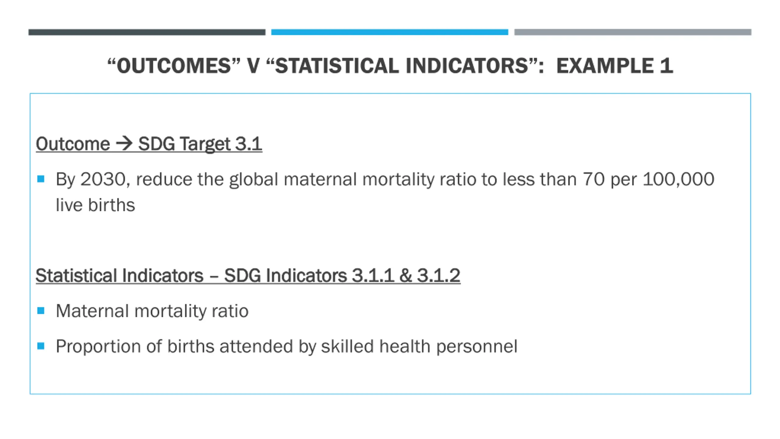 OUTCOMES V STATISTICAL INDICATORS: EXAMPLE 1 Outcome Outcome SDG Target 3.1 SDG Target 3.1 By 2030, reduce the global maternal mortality ratio to less than 70 per 100,000 live births Statistical Indicators Statistical Indicators SDG Indicators 3.1.1 & 3.1.2 SDG Indicators 3.1.1 & 3.1.2 Maternal mortality ratio Proportion of births attended by skilled health personnel