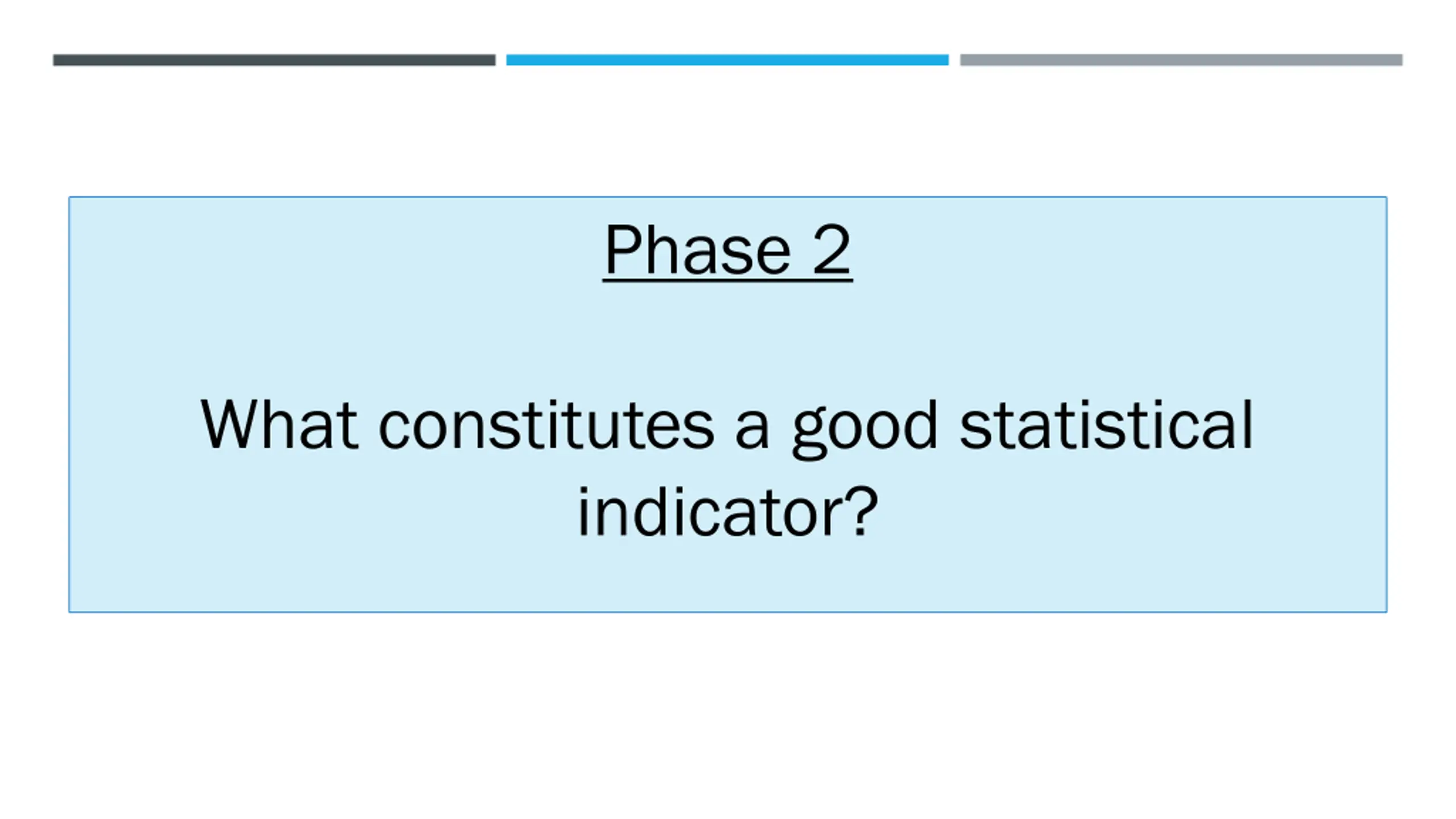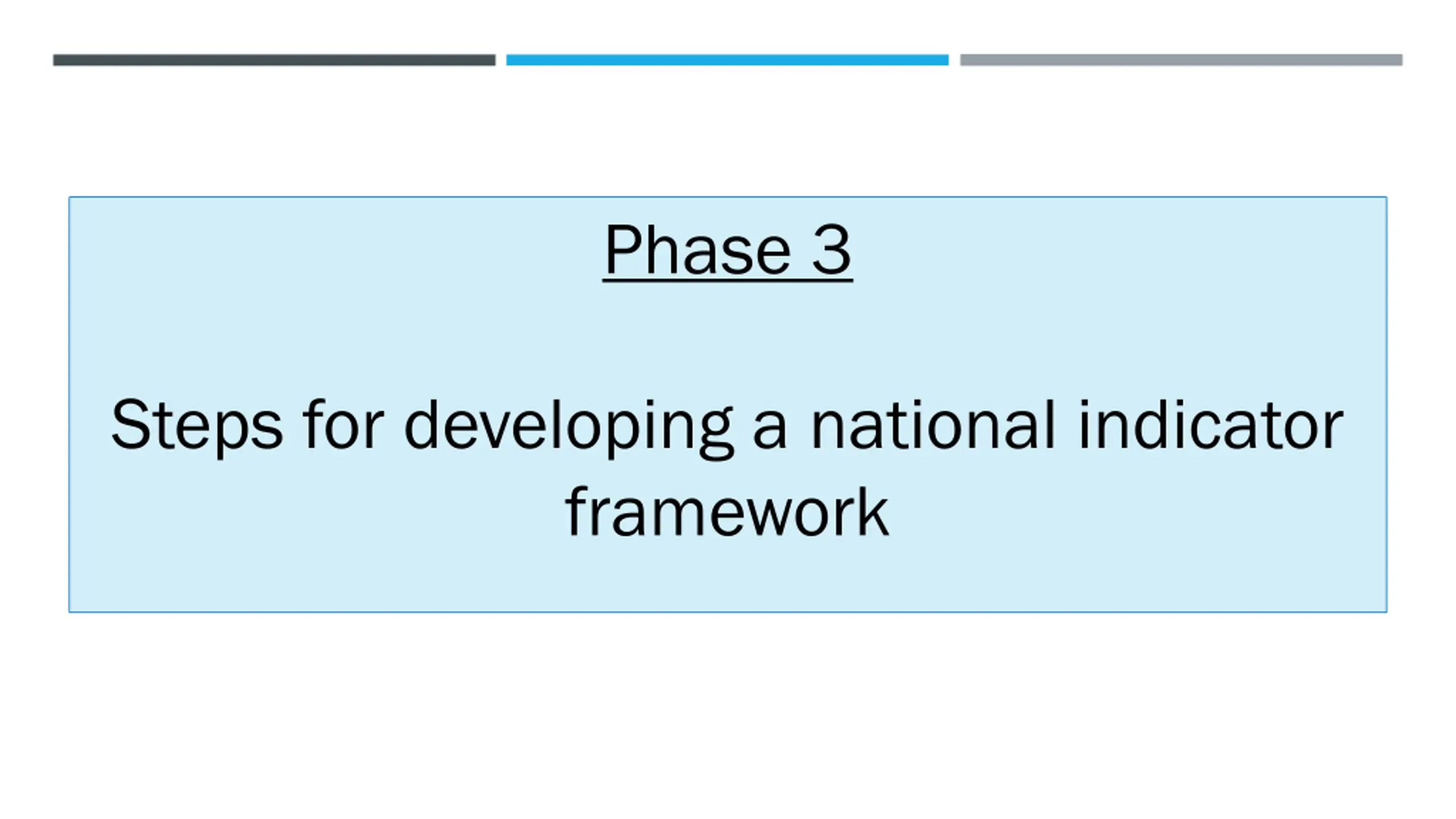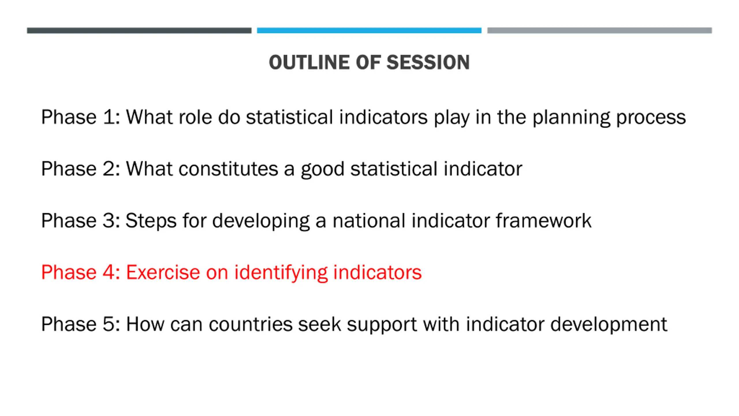 OUTLINE OF SESSION Phase 1: What role do statistical indicators play in the planning process Phase 2: What constitutes a good statistical indicator Phase 3: Steps for developing a national indicator framework Phase 4: Exercise on identifying indicators Phase 5: How can countries seek support with indicator development