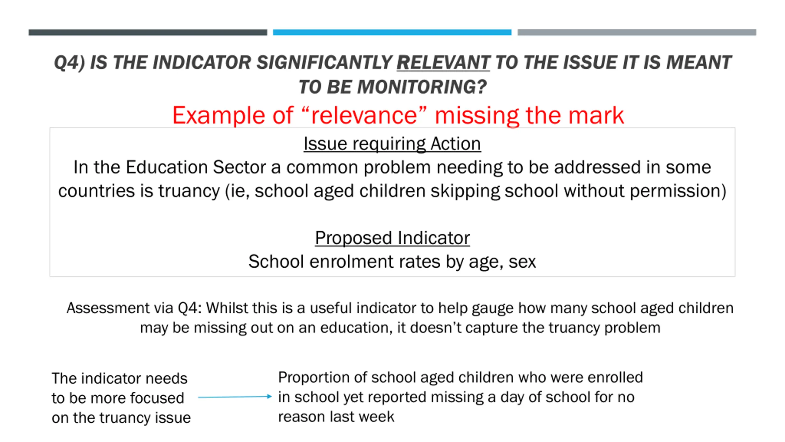 Q4) IS THE INDICATOR SIGNIFICANTLY R RELEVANT TO THE ISSUE IT IS MEANT TO BE MONITORING? Example of relevance missing the mark Issue requiring Action In the Education Sector a common problem needing to be addressed in some countries is truancy (ie, school aged children skipping school without permission) Proposed Indicator School enrolment rates by age, sex Assessment via Q4: Whilst this is a useful indicator to help gauge how many school aged children may be missing out on an education, it doesn t capture the truancy problem Proportion of school aged children who were enrolled in school yet reported missing a day of school for no reason last week The indicator needs to be more focused on the truancy issue