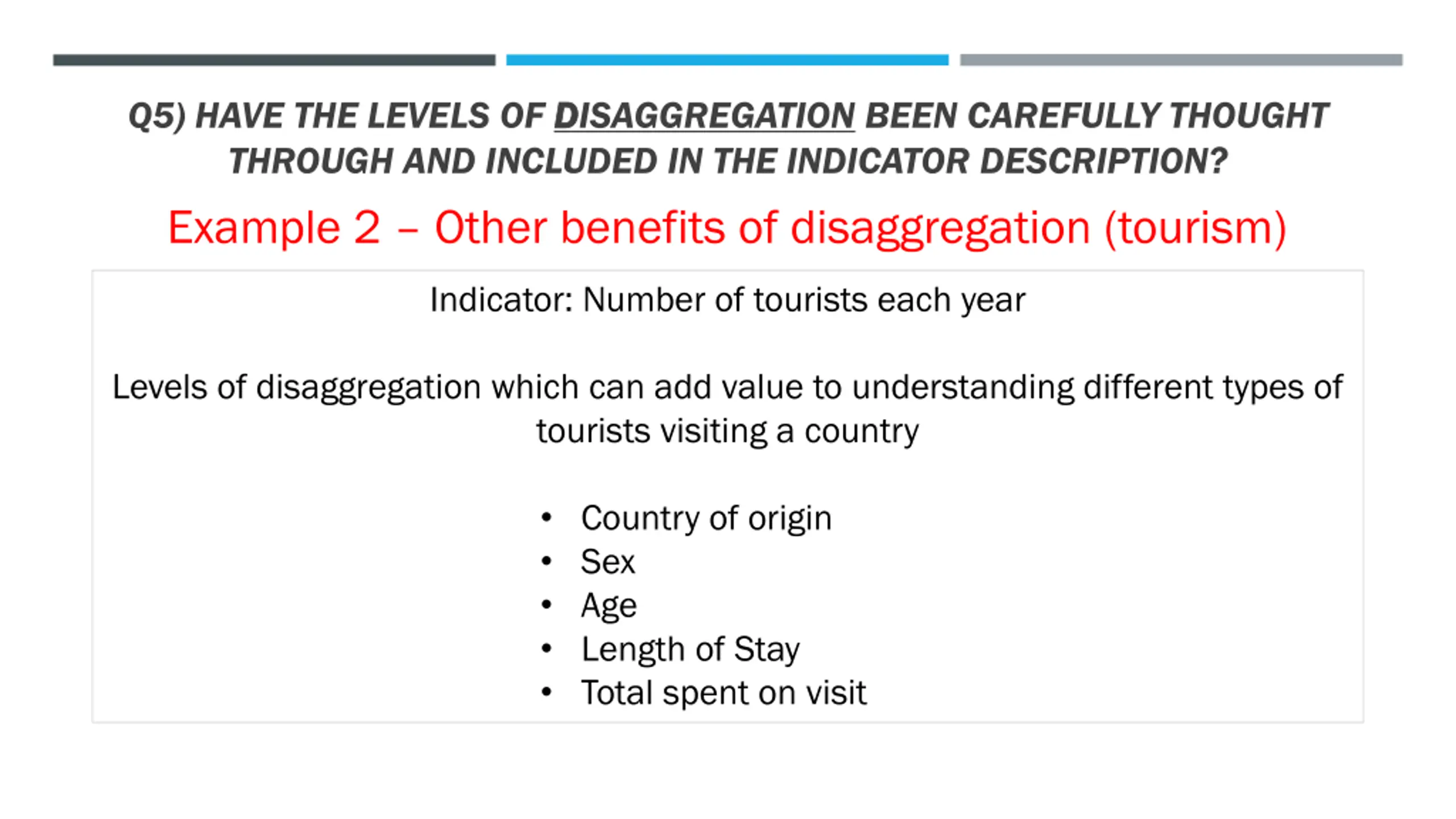 Q5) HAVE THE LEVELS OF D DISAGGREGATION BEEN CAREFULLY THOUGHT THROUGH AND INCLUDED IN THE INDICATOR DESCRIPTION? Example 2 Other benefits of disaggregation (tourism) Indicator: Number of tourists each year Levels of disaggregation which can add value to understanding different types of tourists visiting a country Country of origin Sex Age Length of Stay Total spent on visit