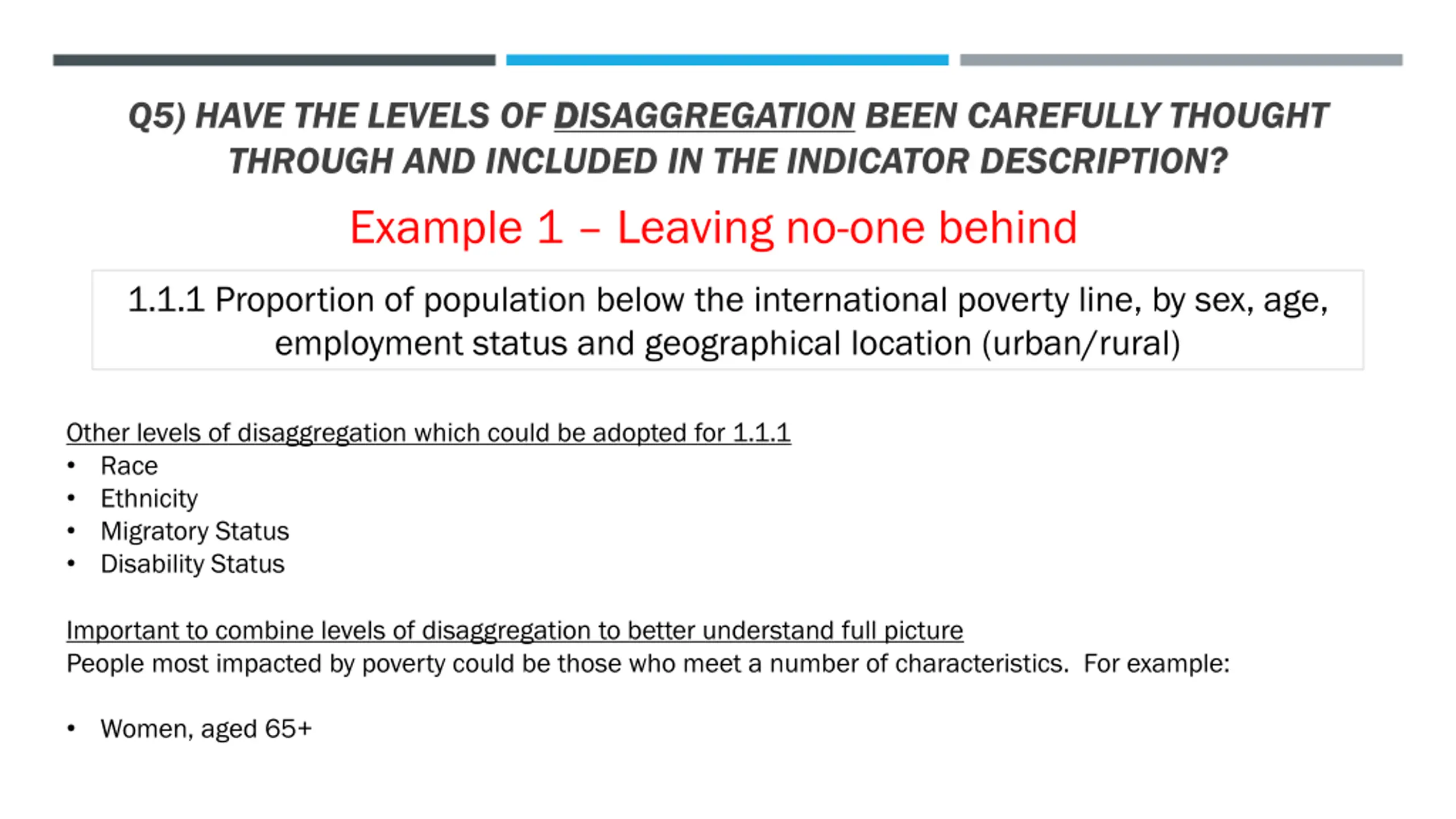 Q5) HAVE THE LEVELS OF D DISAGGREGATION BEEN CAREFULLY THOUGHT THROUGH AND INCLUDED IN THE INDICATOR DESCRIPTION? Example 1 Leaving no-one behind 1.1.1 Proportion of population below the international poverty line, by sex, age, employment status and geographical location (urban/rural) Other levels of disaggregation which could be adopted for 1.1.1 Race Ethnicity Migratory Status Disability Status Important to combine levels of disaggregation to better understand full picture People most impacted by poverty could be those who meet a number of characteristics. For example: Women, aged 65+