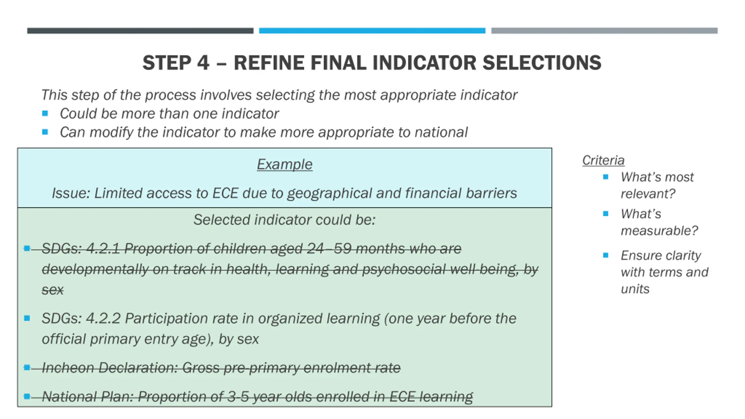 STEP 4 REFINE FINAL INDICATOR SELECTIONS This step of the process involves selecting the most appropriate indicator Could be more than one indicator Can modify the indicator to make more appropriate to national Criteria What s most relevant? What s measurable? Example Issue: Limited access to ECE due to geographical and financial barriers Selected indicator could be: SDGs: 4.2.1 Proportion of children aged 24 59 months who are developmentally on track in health, learning and psychosocial well-being, by sex Ensure clarity with terms and units SDGs: 4.2.2 Participation rate in organized learning (one year before the official primary entry age), by sex Incheon Declaration: Gross pre-primary enrolment rate National Plan: Proportion of 3-5 year olds enrolled in ECE learning