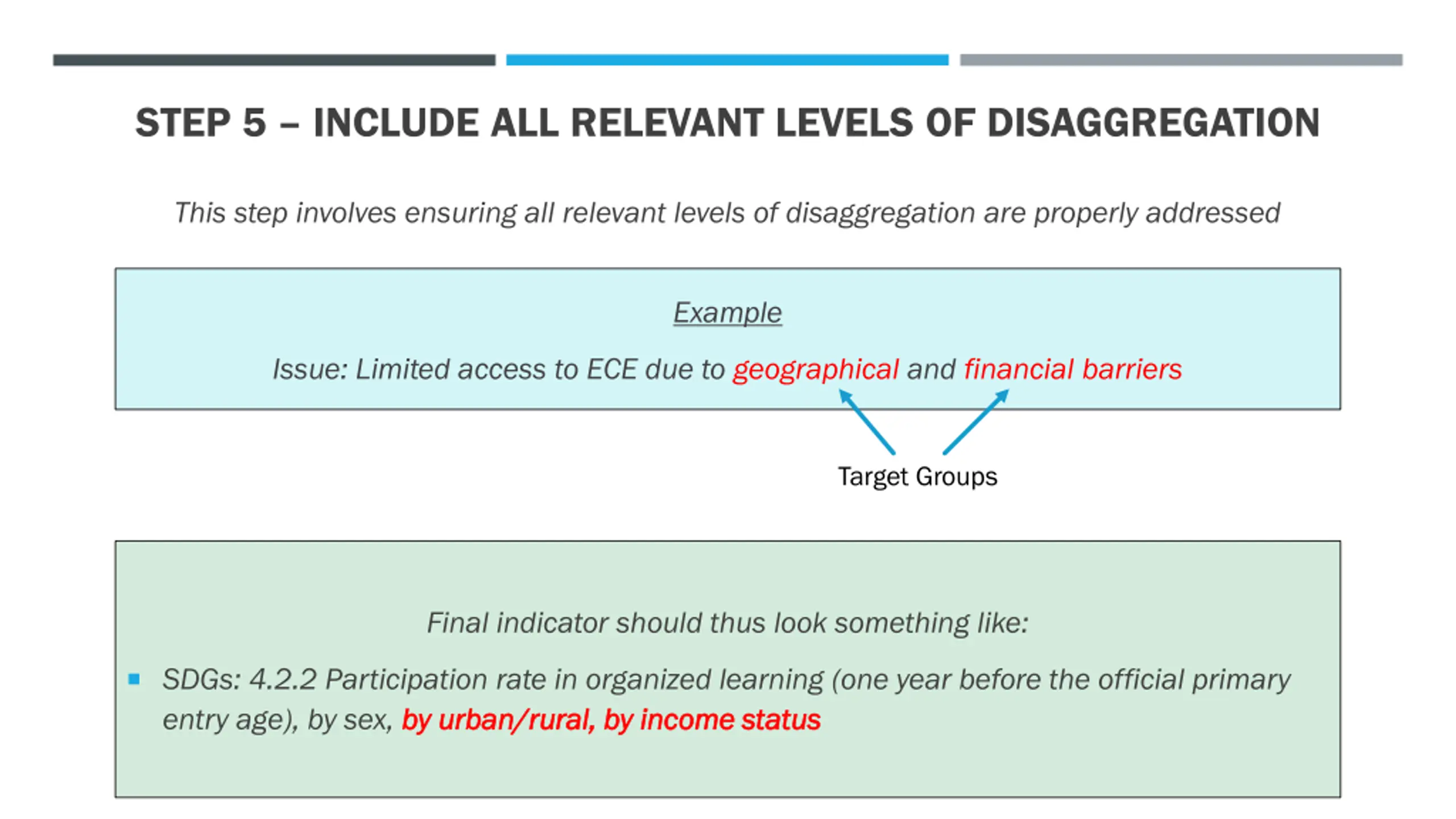 STEP 5 INCLUDE ALL RELEVANT LEVELS OF DISAGGREGATION This step involves ensuring all relevant levels of disaggregation are properly addressed Example Issue: Limited access to ECE due to geographical and financial barriers Target Groups Final indicator should thus look something like: SDGs: 4.2.2 Participation rate in organized learning (one year before the official primary entry age), by sex, by urban/rural, by income status by urban/rural, by income status